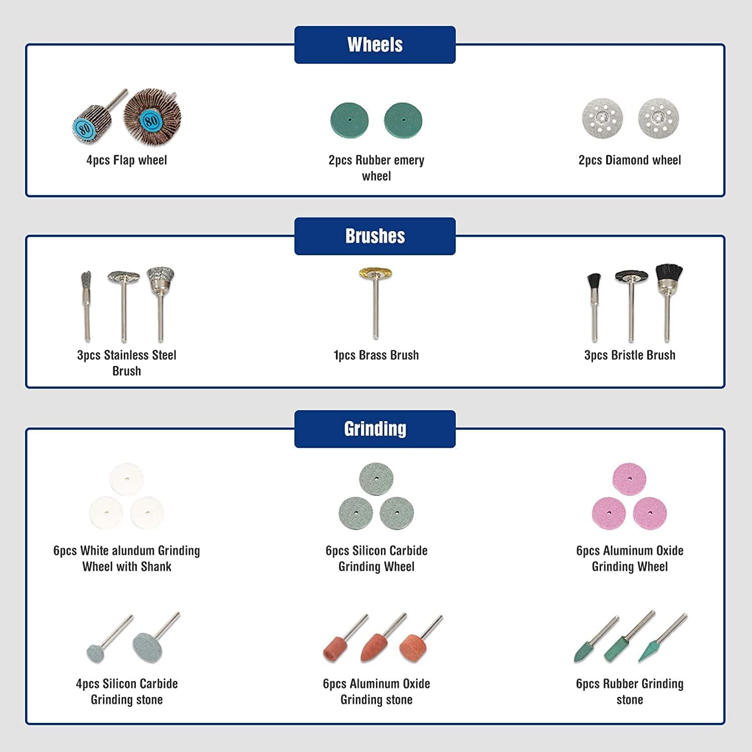 - Dieses Set enthält komplettes Drehwerkzeug-Zubehör zum Schneiden, Schleifen, Schleifen, Schärfen, Polieren, Gravieren, Bohren, Reinigen, erfüllt Ihre verschiedenen DIY-Anwendungsanforderungen