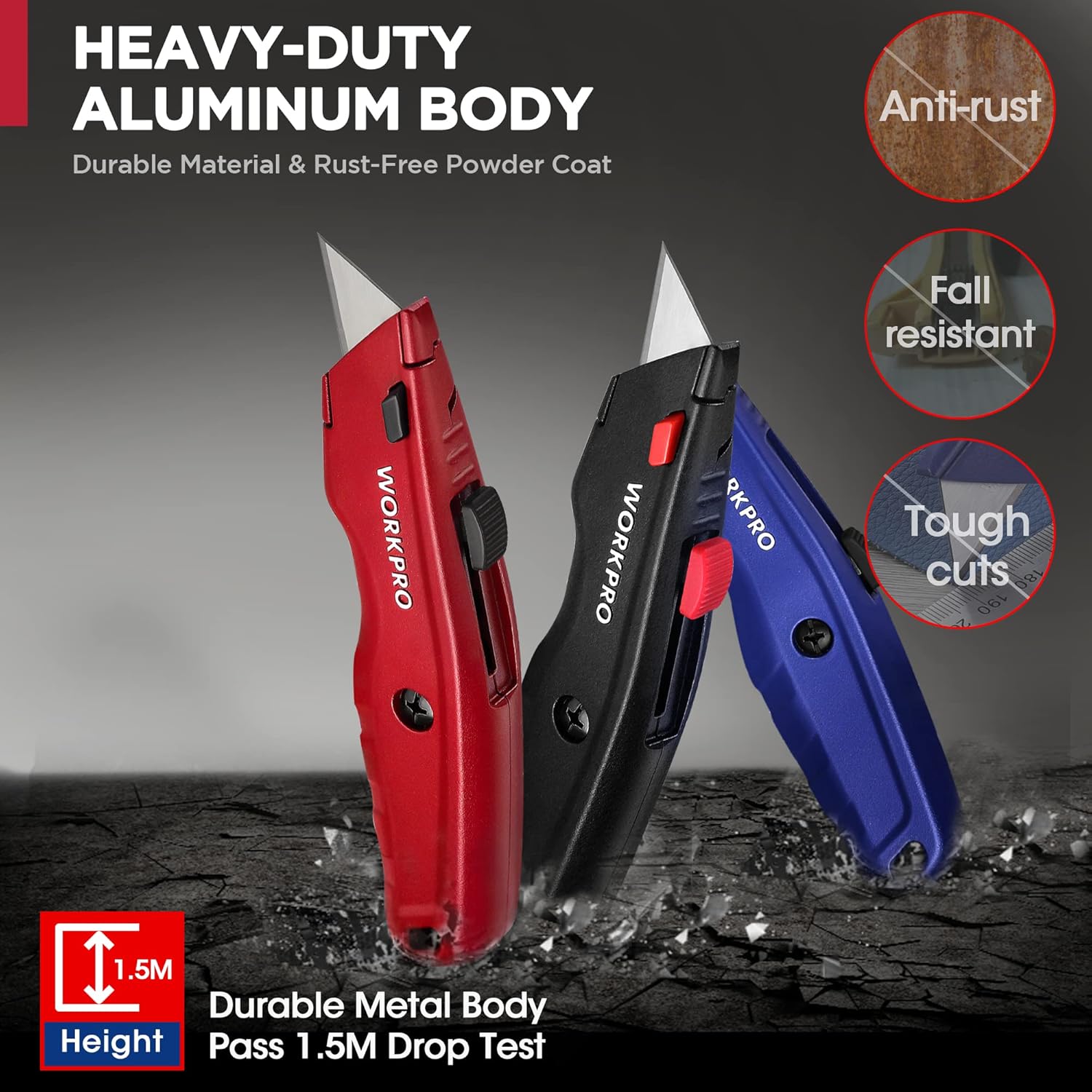 - 【Strapazierfähiger Teppichmesser】Das Design aus Aluminiumlegierung mit rostfreier Pulverbeschichtung macht den Kartonschneider langlebig und leicht (90 g). Es besteht den Falltest aus 1,5 m Höhe. SK5-Klingen durch 1922 °F Wärmebehandlung sind bis