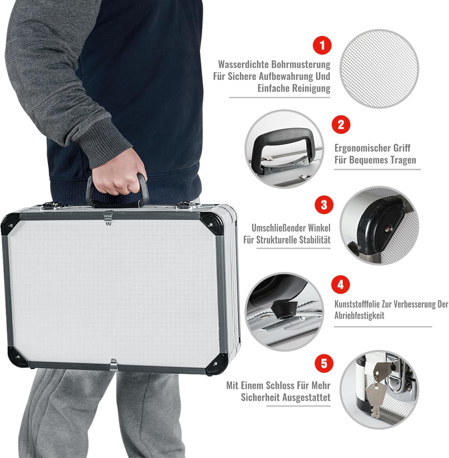 - 🔎【Werkzeugkoffer mit Aluminum Gehäuse】:Der Werkzeugkoffer hat stabile Alu-Profile und Aussenflächen aus Aluminium mit abgerundeten Stosskanten&Eckenschutzund Angenehmem-Tragegriff für einen leichten Transport.