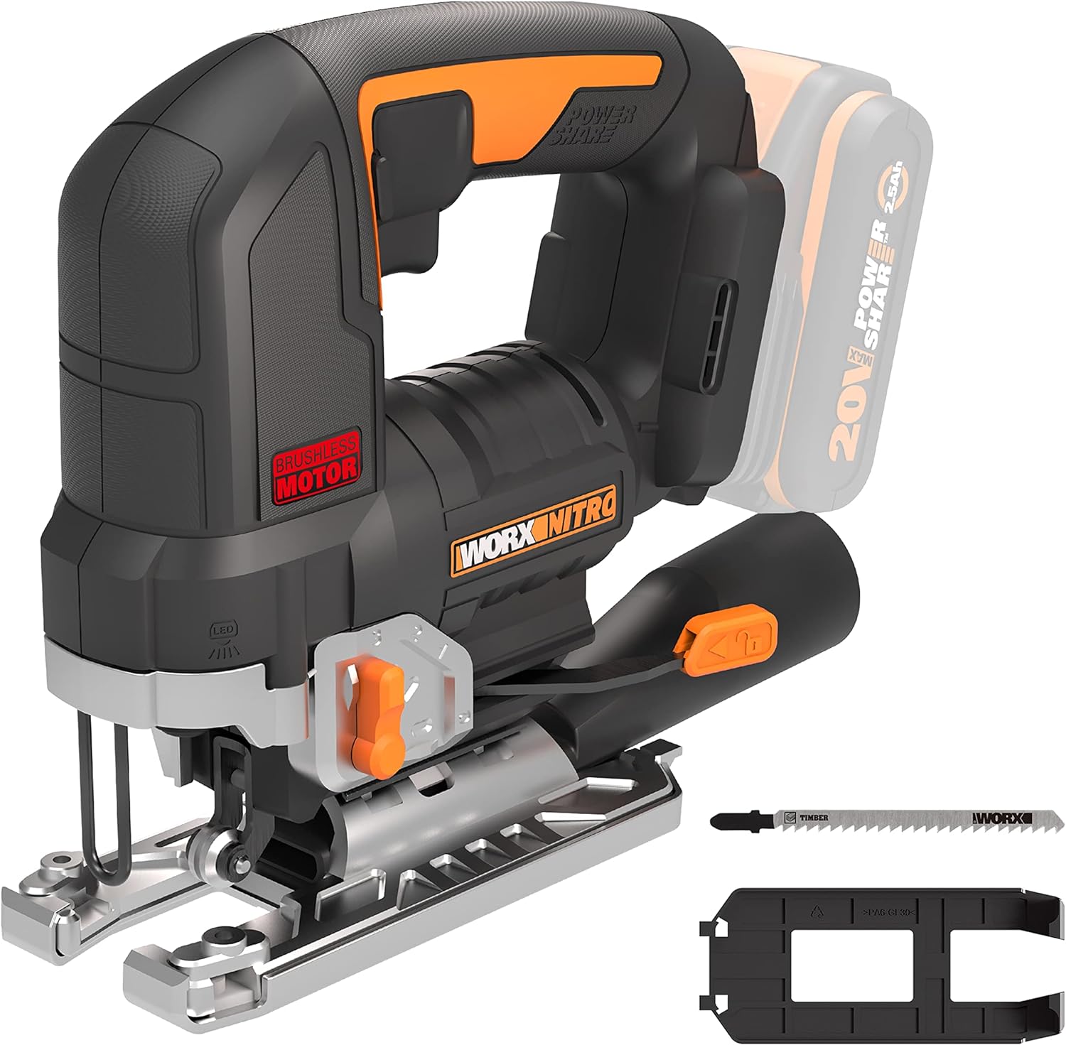 - Lieferumfang: 1 x WORX WX542.9 Akku-Pendelhubstichsäge ohne Akku und Ladegerät, 1 x Absaugadapter, 1 x Holzsägeblatt