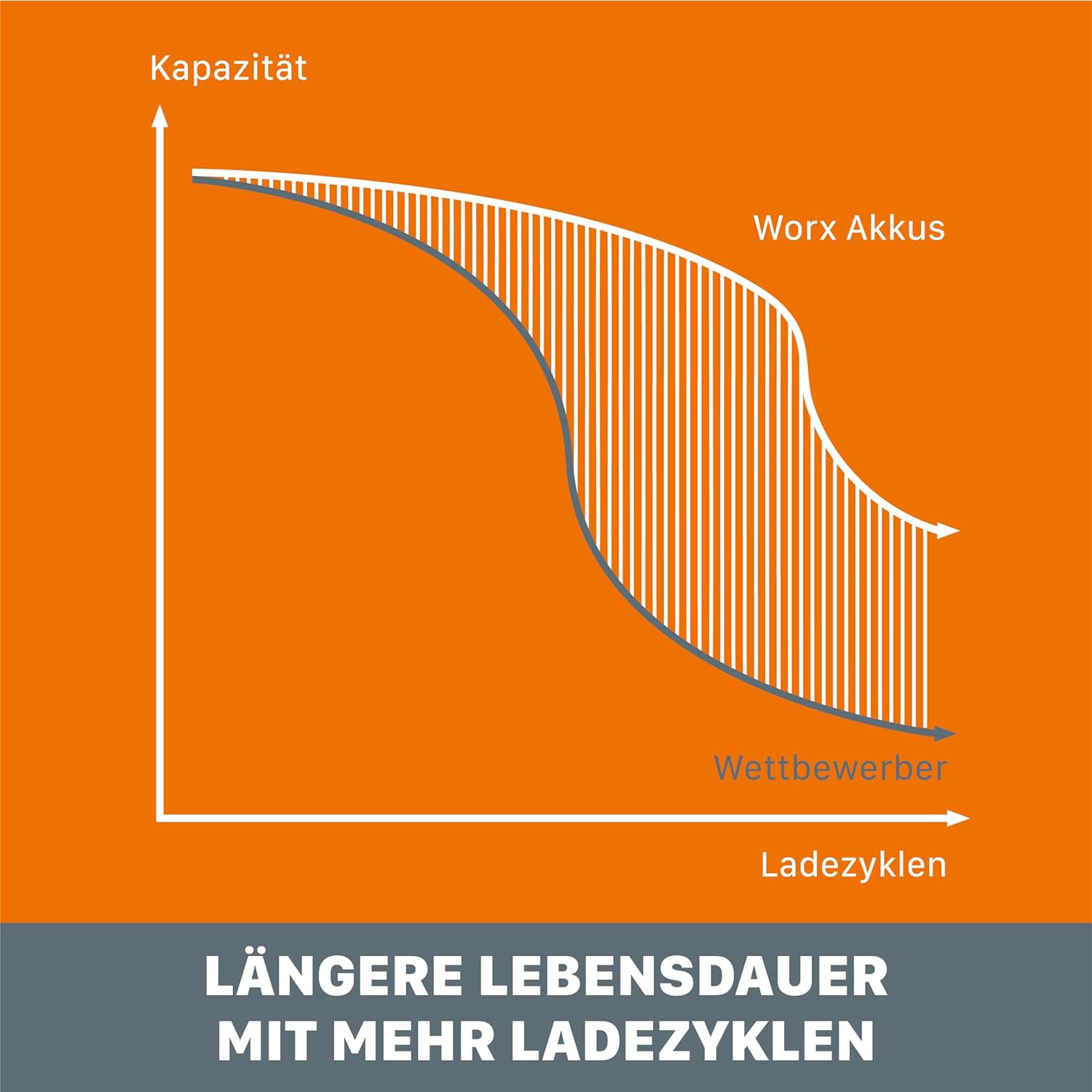 - Der Lithium-Ionen Technologie des WORX Akkus sorgt für eine hohe Kapazität und geringe Selbstentladung und verhindert den Memory-Effekt