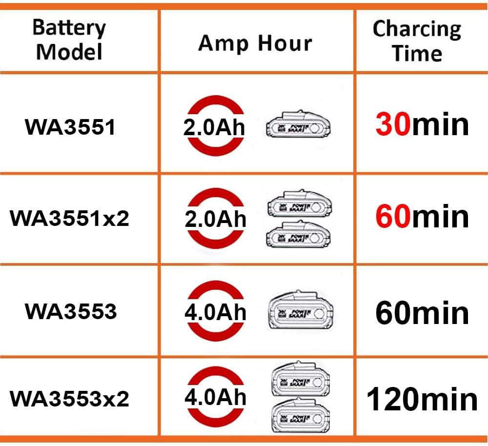 - Schnell wieder einsatzbereit sein: Mit der Ladestation ist das gleichzeitige Aufladen von zwei Worx 20 Volt Akkus möglich / Der Überladeschutz erhöht die Lebenszeit der aufzuladenden Akkus