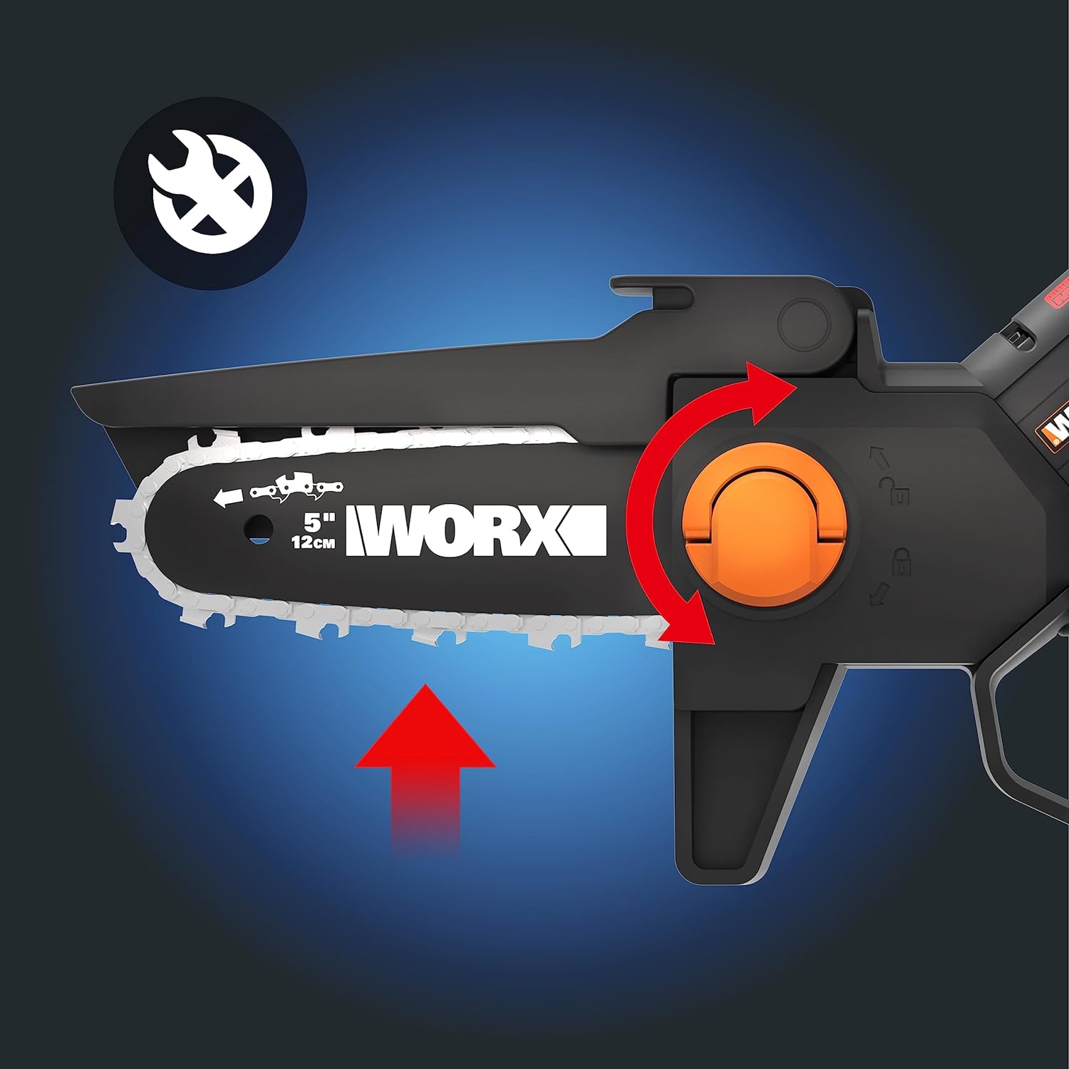 - Lieferumfang: Worx Nitro Mini-Kettensäge WG325E, 1x 2,0 Ah Akku WA3639, 1x Ladegerät WA3880, 1x Kette WA0142, 1x Schwert WA0151, 1x Schutzabdeckung für das Sägeblatt