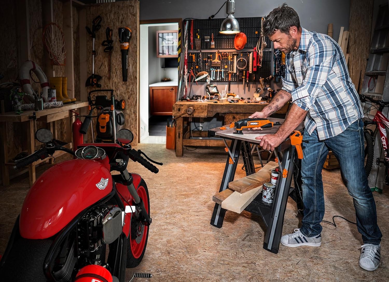 • Vielseitiger Arbeitstisch, in Sekunden zu einem Sägebock und einer Werkbank umgebaut; mit praktischem, integriertem Aufbewahrungsregal, kein Aufbau nötig.