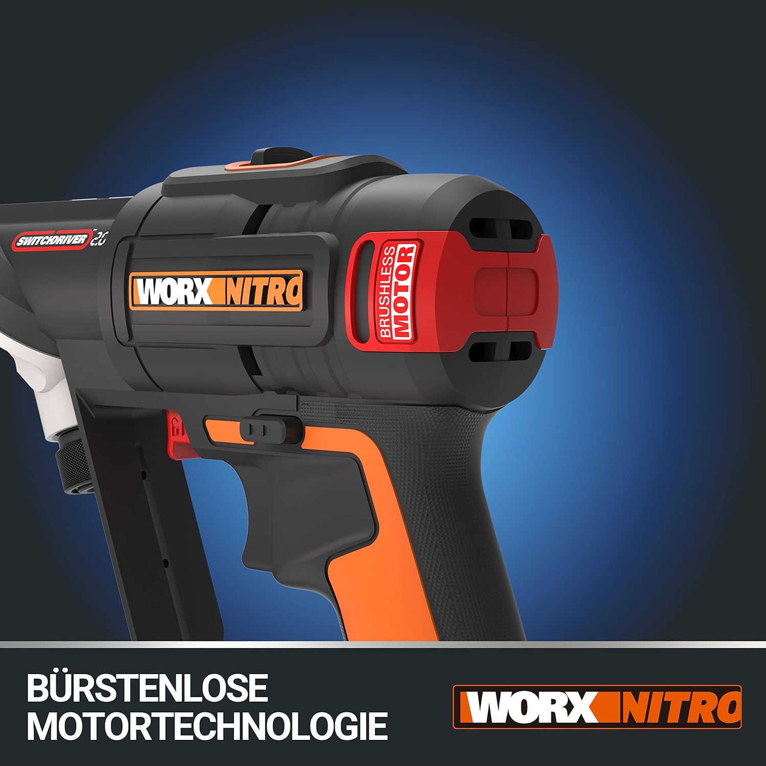 - Lieferumfang: WORX WX177 NITRO Akku-Bohrschrauber Switchdriver, 2Ah Akku, Ladegerät, Haken, Bit-Clip, 4 x HSS Bohrer, 2 x Schraberbits