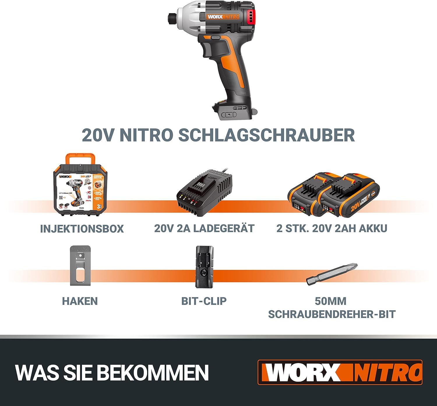 - Lieferumfang: 1 x WORX WX261 Akku-Schlagschrauber / Inkl. 2 x PowerShare-Akkus, 1 x Ladegerät, 1 x Koffer, 1 x Gürtel-Clip