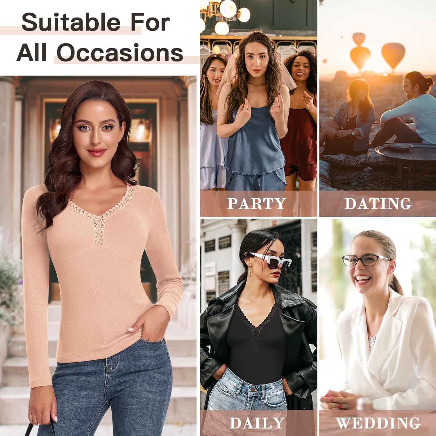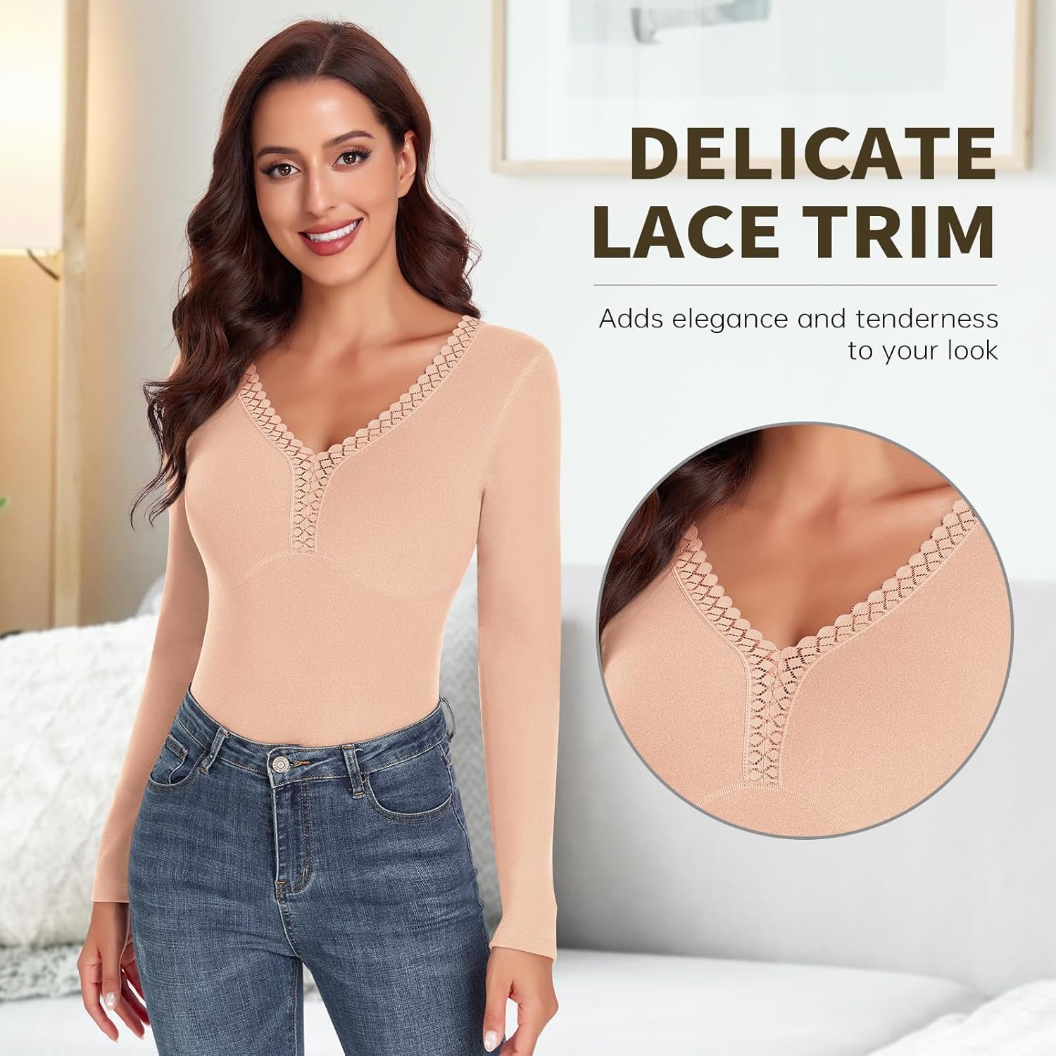 - 【Perfekte Baselayer für kalte Tage】 Das Thermoshirt für Damen kann im Herbst und Winter als Basisschicht warmer Kleidung oder allein getragen werden. Schmale Passform, einfarbig, mit langen Ärmeln und elegantem Spitzen-V-Ausschnitt, ein tolles