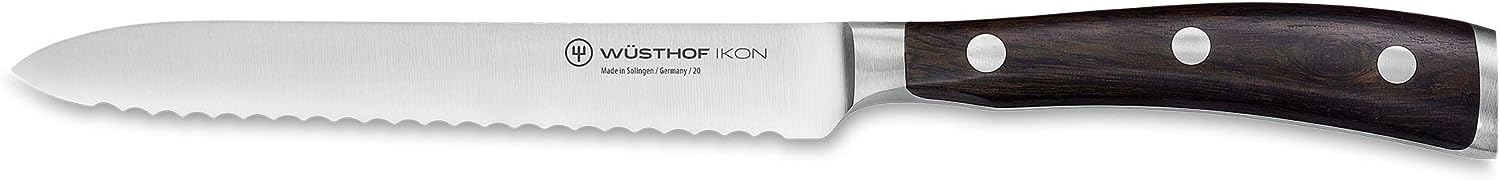 - Die extrem scharfe Klinge, die optimale Balance durch die spezielle Doppelkropf-Geometrie und der erlesene, individuell gemaserte Holzgriff machen dieses Messer der Ikon Serie zu einem eleganten Eyecatcher am schön gedeckten Frühstücks-Tisch