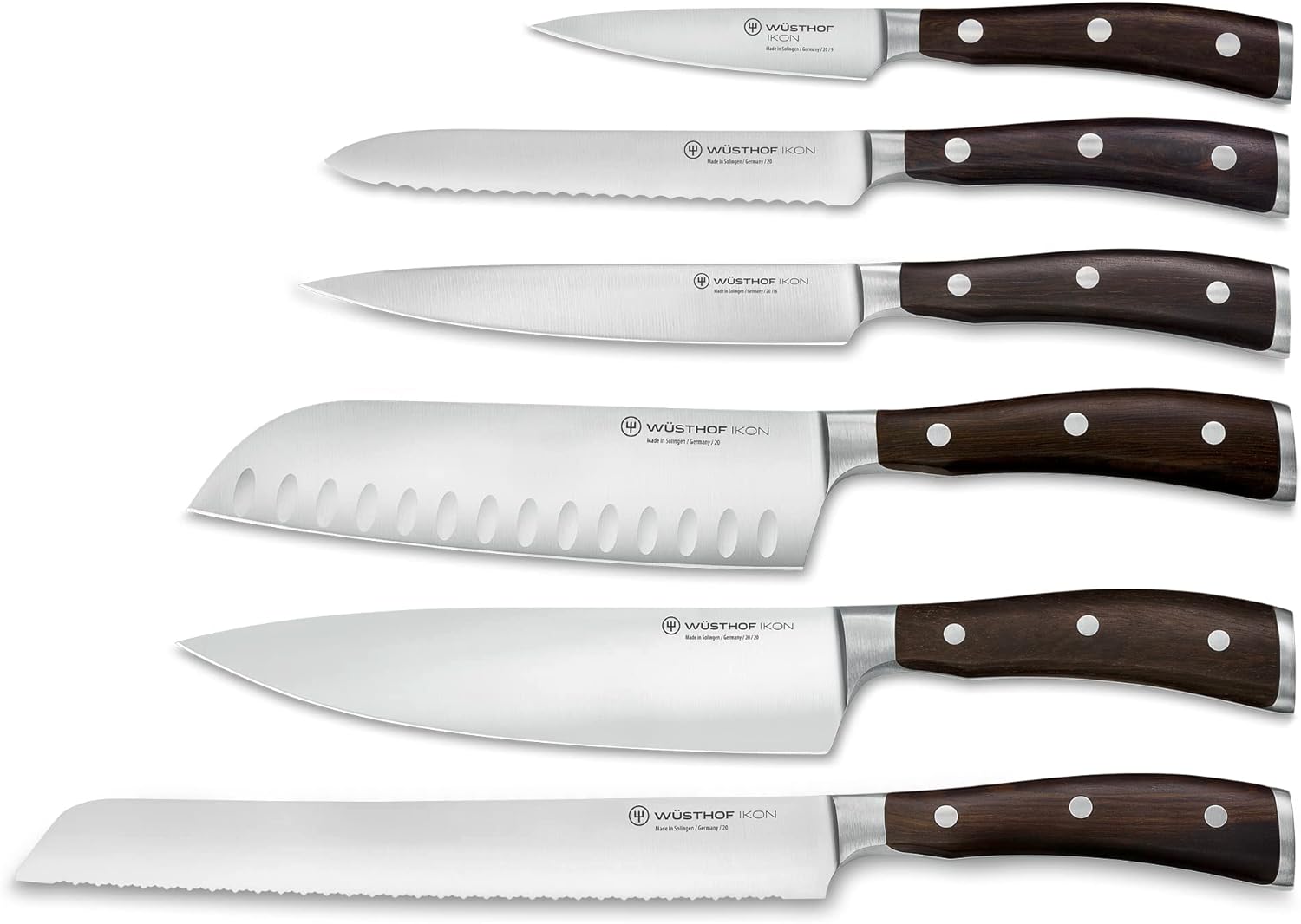 - Ikon Messerset mit stilvoller Profi-Messer Grundausstattung: Gemüsemesser mit 9 cm Klinge, Aufschnittmesser 14 cm mit Sägeschliff, Schinkenmesser 16 cm, Brotmesser 23 cm mit Wellenschliff, Santoku mit Kullen 17 cm, Kochmesser 20 cm