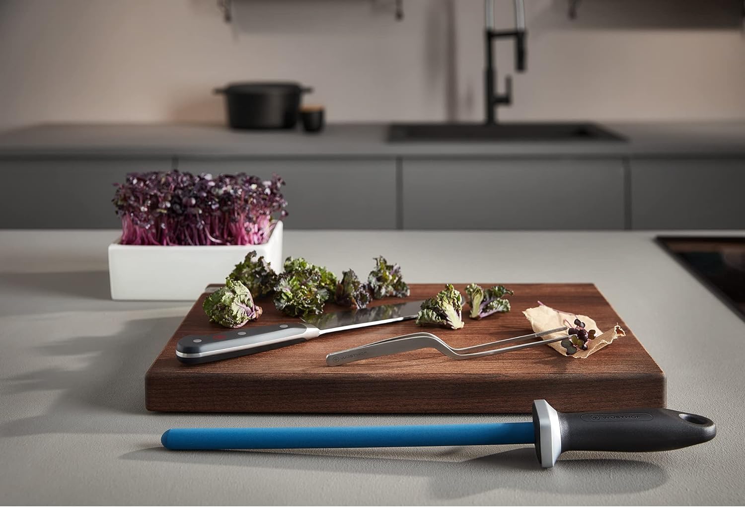 - Messer richtig schärfen: Ein Schärfstab aus Keramik erzeugt etwas weniger Abrieb als ein Diamantstab, ist im Ergebnis aber feiner und langlebiger. Für das tägliche Aufrichten der Wate (Schneide) empfehlen wir zusätzlich einen Wüsthof Wetzstahl