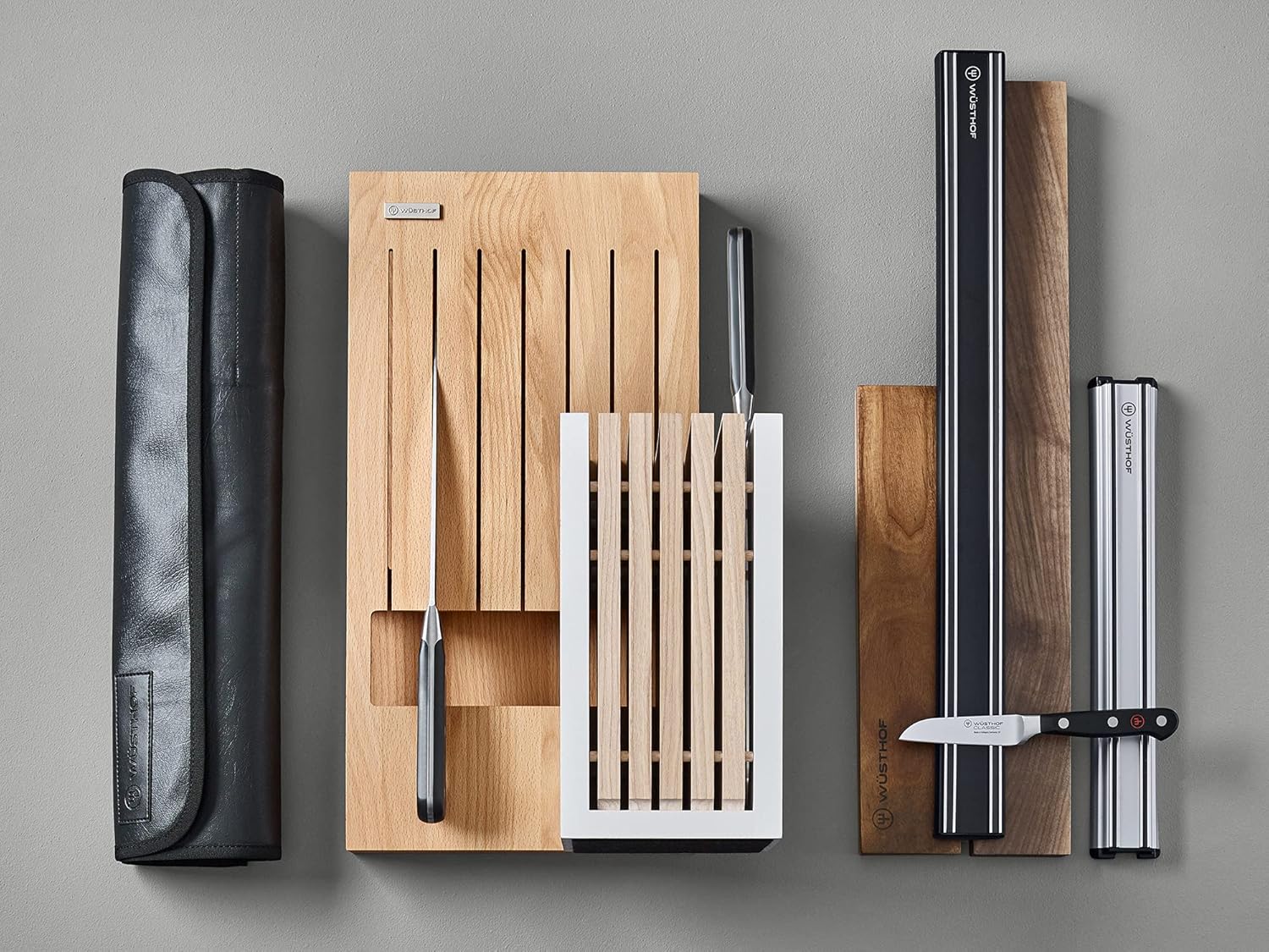 - Auch aus Aluminium (30cm breit), hellerem Akazien-Holz oder dunklerem Walnuss-Holz (je 30 cm o. 50 cm) erhältlich. Weitere Storage-Lösungen (Messerblock, Messereinsatz für Schubladen, Rolltasche, Klingenschützer) finden sie im grossen Wüsthof