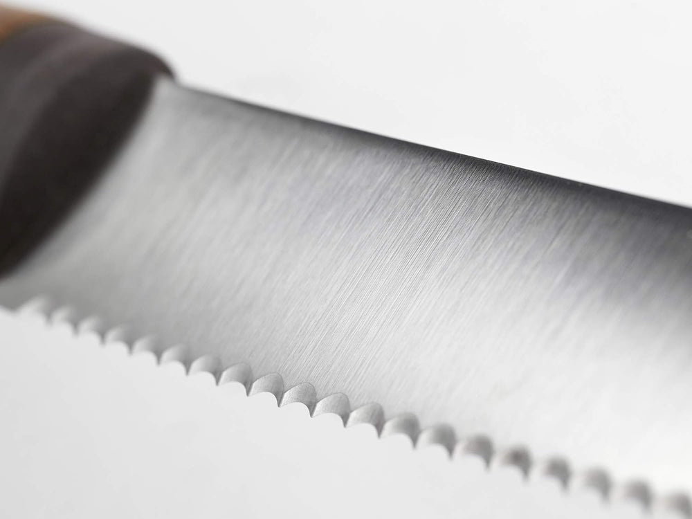 - Ofenfrisches Gebäck, harte Brotsorten oder knusprigen Braten schneidet die Brotsäge genauso präzise wie eigenes Gemüse vom Feld oder Früchte mit fester Haut. Die Welle (Sägeschliff) der 23cm Klinge gleitet durch jede Kruste – ohne sie zu