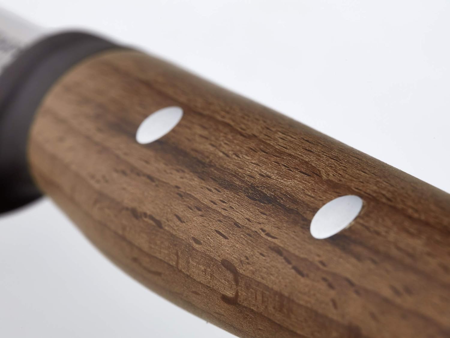 - Angenehm und kraftvoll! Der Holzgriff aus geräucherter Buche stammt aus nachhaltigem Anbau und liegt optimal in der Hand. Er ist widerstandsfähig und Wasser abweisend. Gemeinsam mit dem rutschfesten Kropf gibt er sicheren Halt in Küche und Garten