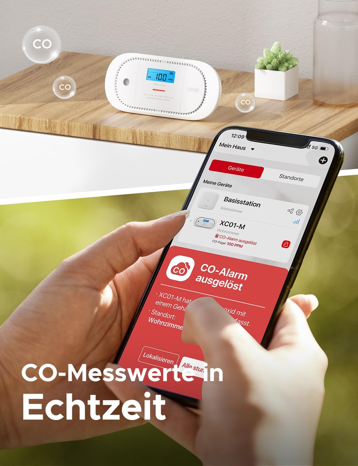 - CO-Werte in Echtzeit: Sobald die CO-Werte 100 ppm erreichen, erhalten Sie umgehend eine Warnmeldung über potenzielle Risiken, damit Sie ohne lange Reaktionszeiten abwarten zu müssen, unverzüglich handeln können. Die CO-Werte werden über die App in