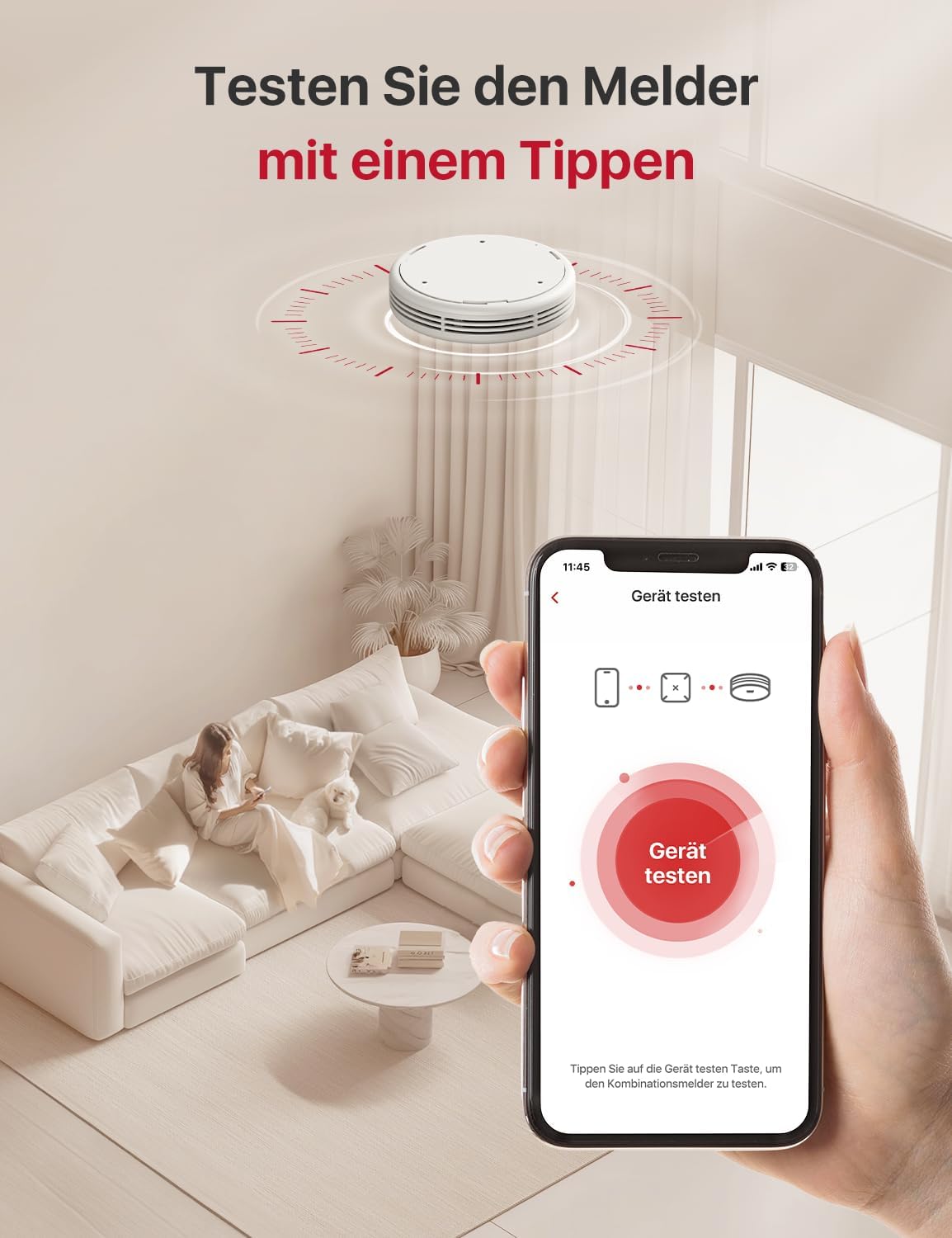 - App-Warnungen: Erhalten Sie sofortige Warnungen auf Ihrem Telefon, wenn das Gerät eine Gefahr erkennt oder sich sein Status ändert; teilen Sie den Smart Rauch- und Kohlenmonoxid-Melder mit bis zu 12 Familienmitgliedern, um sie auf dem Laufenden zu