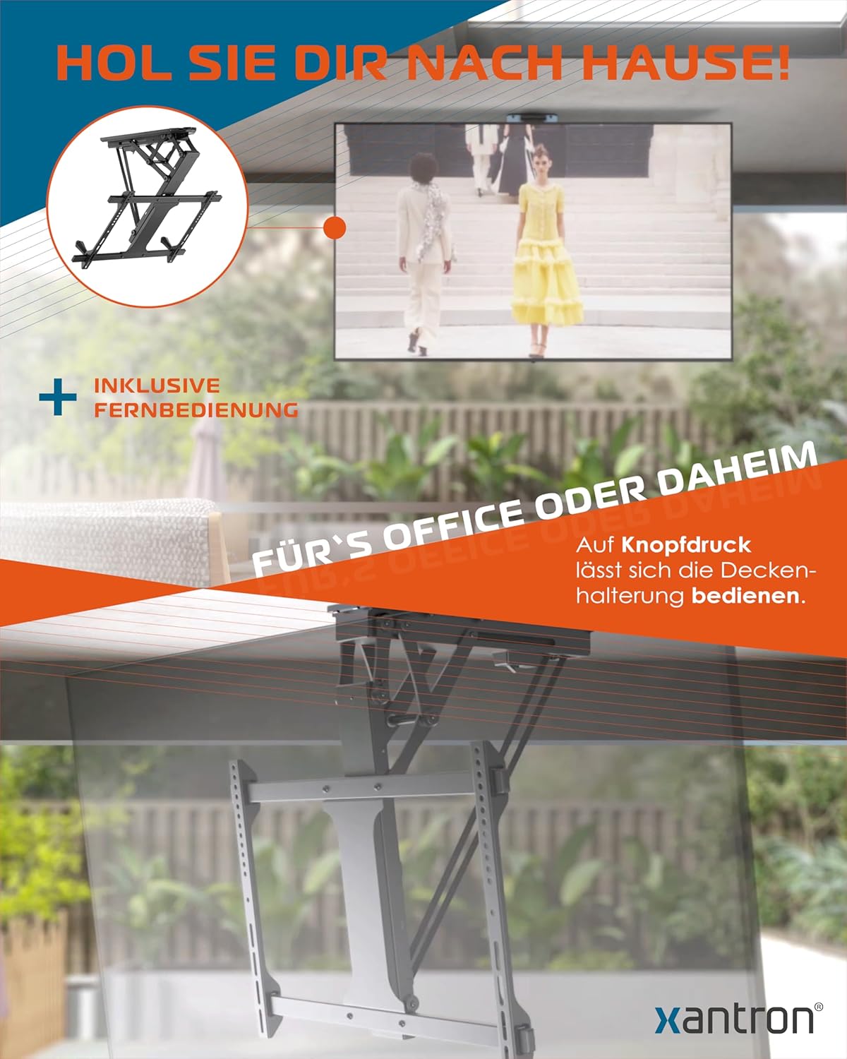 - PERFEKTE FLEXIBILITÄT – Mit der Xantron TV Deckenhalterung können Sie Ihren Bildschirm stufenlos zwischen 0° und 75° neigen und um ±2° drehen. Diese TV-Halterung für Deckenmontage ermöglicht eine optimale Sicht, selbst an schrägen Decken.
