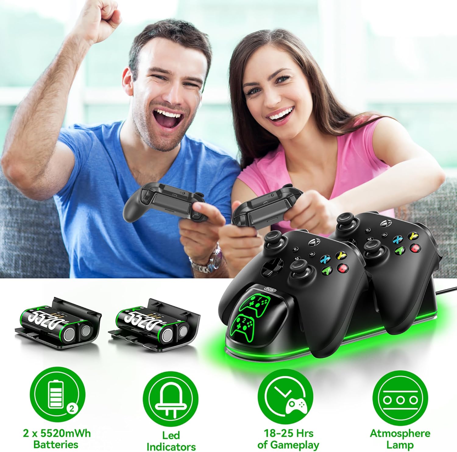 - 【Was Sie bekommen】Diese Xbox Controller Ladestation ist auch eine perfekte Aufbewahrung für ihre Xbox Controller, wenn sie nicht in Gebrauch sind. In der Lieferumfang sind: 1 x Ladestation, 2 x wiederaufladbare Xbox Controller Akku Pack, 4 x