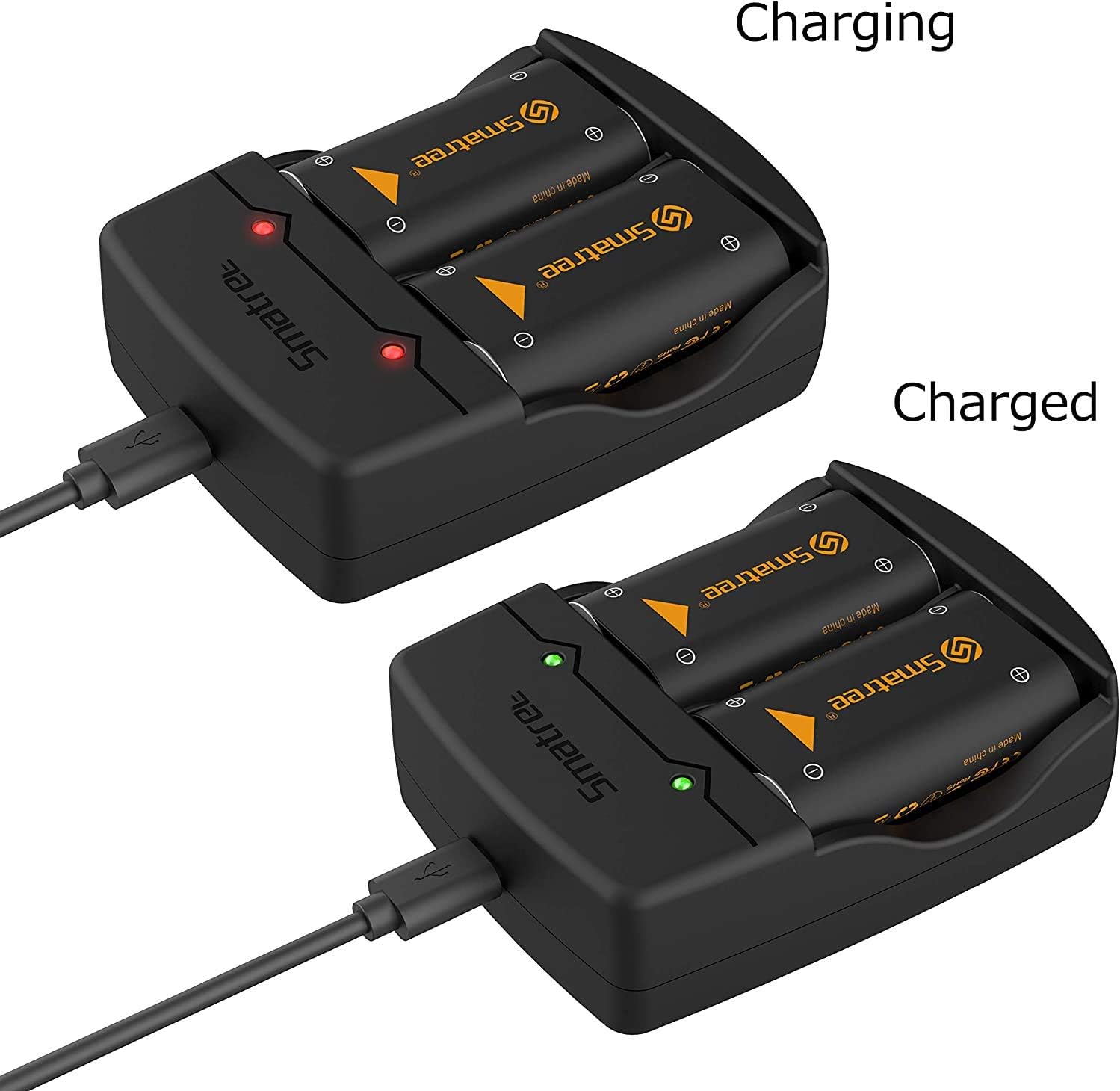 - 【Dual Channel Ladegerät】 Das Dual-Kanal Ladegerät lädt 4 Akkus auf 100% in ca. 5-6 Stunden ununterbrochen auf, wenn der DC-Eingang > 5 V/1,5 A eingeht.