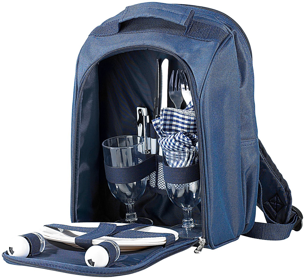 - Komplett befüllt für 2 Personen: Je 2 Teller, Gläser, Gabeln, Messer, Stoff-Servietten, Gewürzstreuer sowie 1 Kellnermesser mit Korkenzieher und Kapselheber • Grosszügiges Kühlfach mit Reissverschluss: Volumen ca. 4 Liter (Innenmasse 330 x 230 x 60 mm)