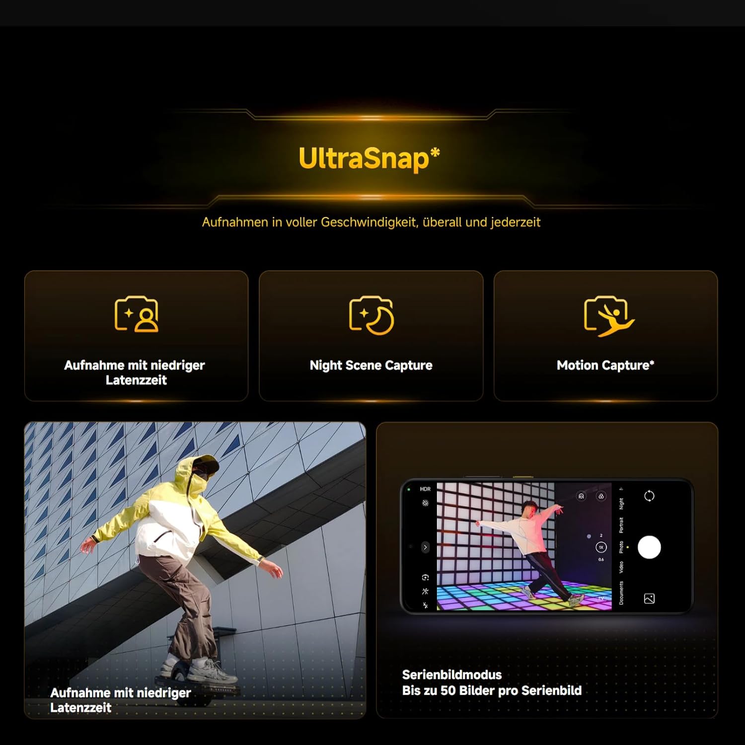 - UltraSnap, Burst-Shot-Modus, Porträts, KI-Funktionen, 4K-Video bis zu 4K/62fps, Nachtmodus-Video, Bildqualität