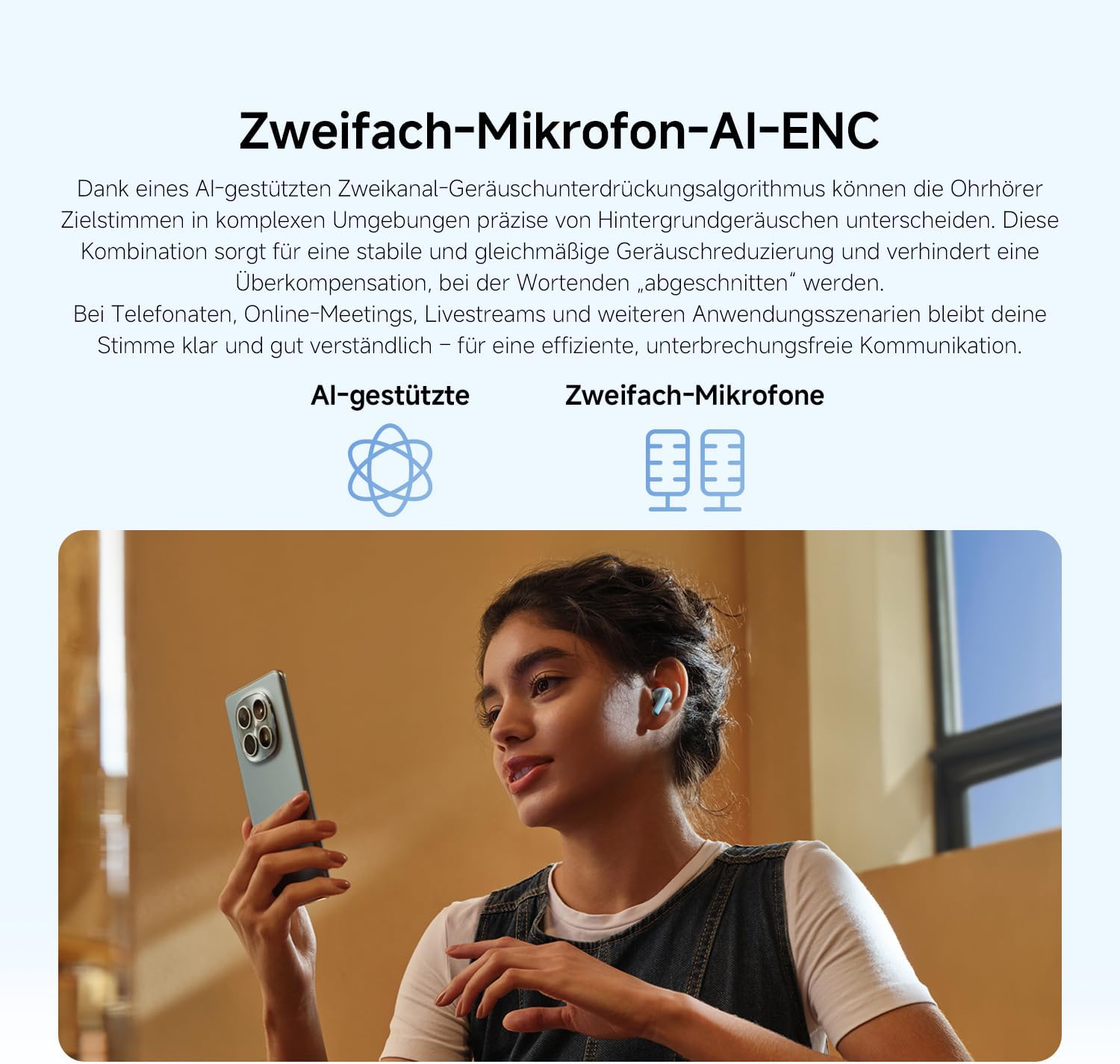 - Dual-Mikrofon mit KI-Geräuschunterdrückung für gut verständliche Anrufe:Dank eines Zweikanal-KI-Algorithmus zur Geräuschunterdrückung können die Earbuds die gewünschten Stimmen in komplexen Umgebungen genau von Hintergrundgeräuschen