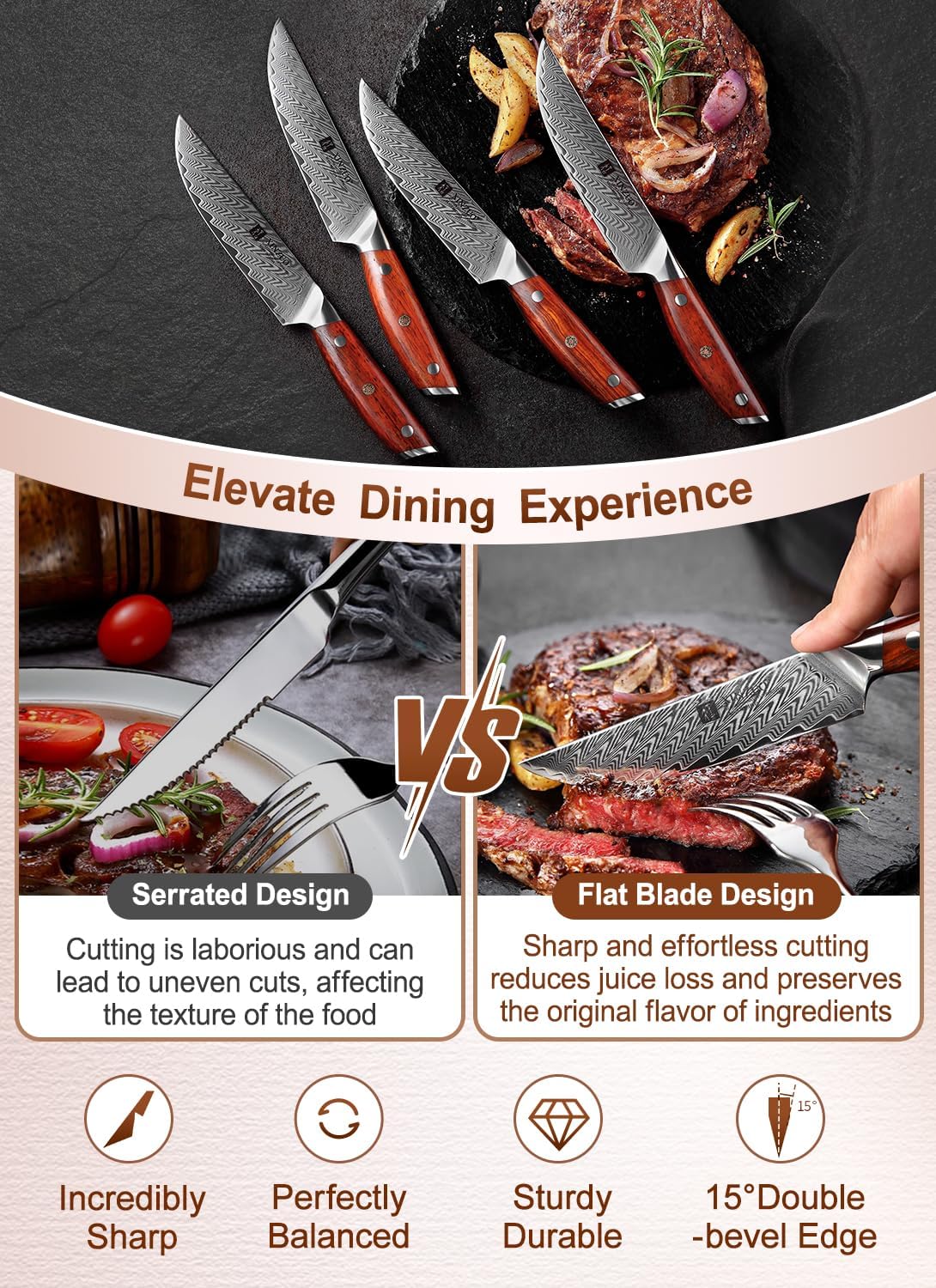 - 【Exquisite Handwerkskunst】 Dieses Steakmesser verwendet die besten Materialien, kombiniert mit modernster Handwerkskunst und innovativem Design. Erstellt unter verschiedenen strengen Tests ein ultrahochleistungsfähiges Tafelmesser, das Ihnen ein angenehmes Speiseerlebnis bietet. Diese extrem scharfen Klingen sorgen für einen perfekten Schnitt und sorgen dafür, dass alle Lebensmittel den ursprünglichen Geschmack behalten.