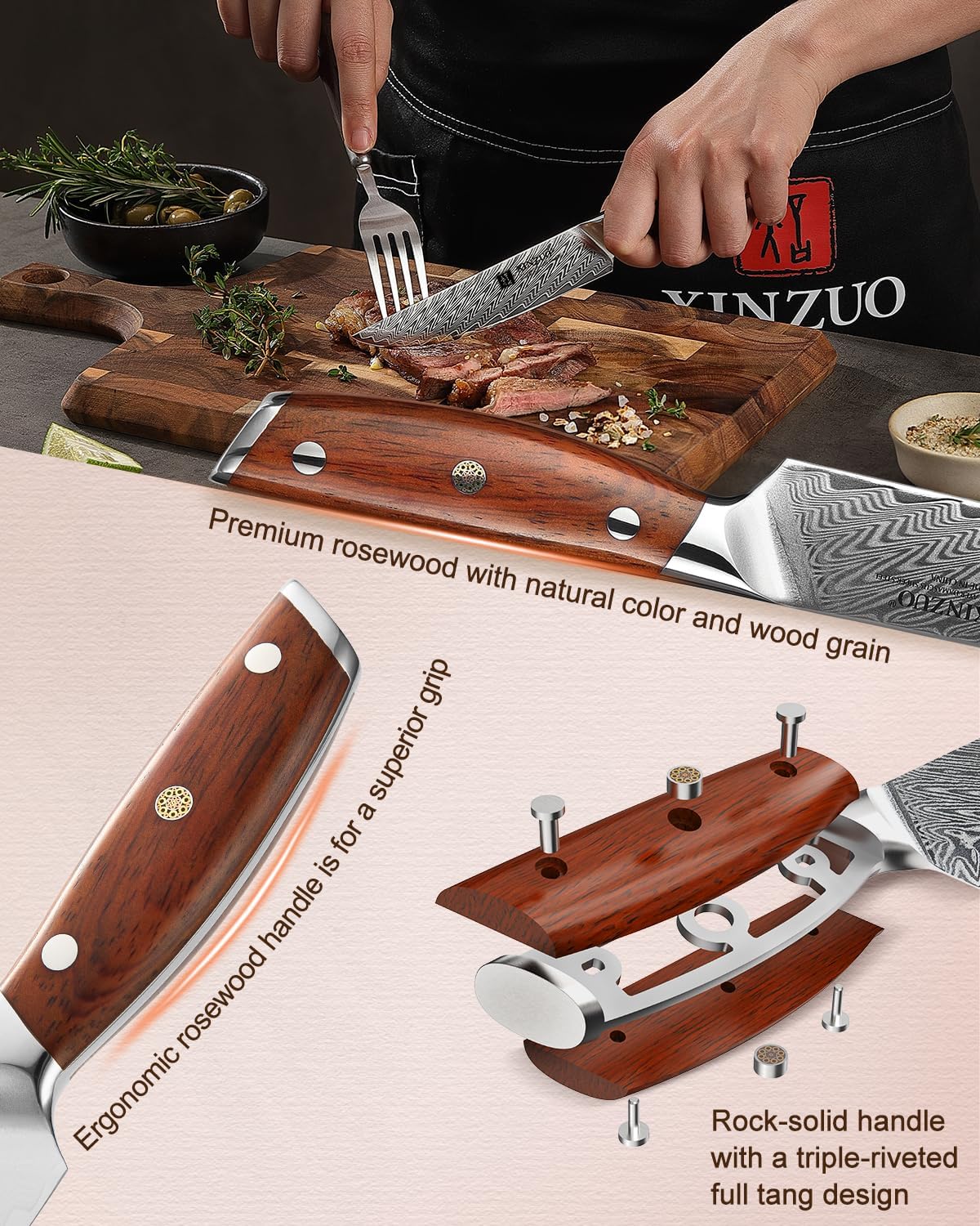 - 【Natürlicher Rosewood Griff】 Ergonomisches Griffdesign sorgt für einen bequemen Griff und bietet die beste Beweglichkeit und perfekte Balance. Natürliches Rosenholz hat eine ursprüngliche Textur und natürliche Farbe, ist nicht leicht zu verformen und zu knacken und kann leicht verschiedene Steaks, Pizzen, Gemüse und Obst schneiden.