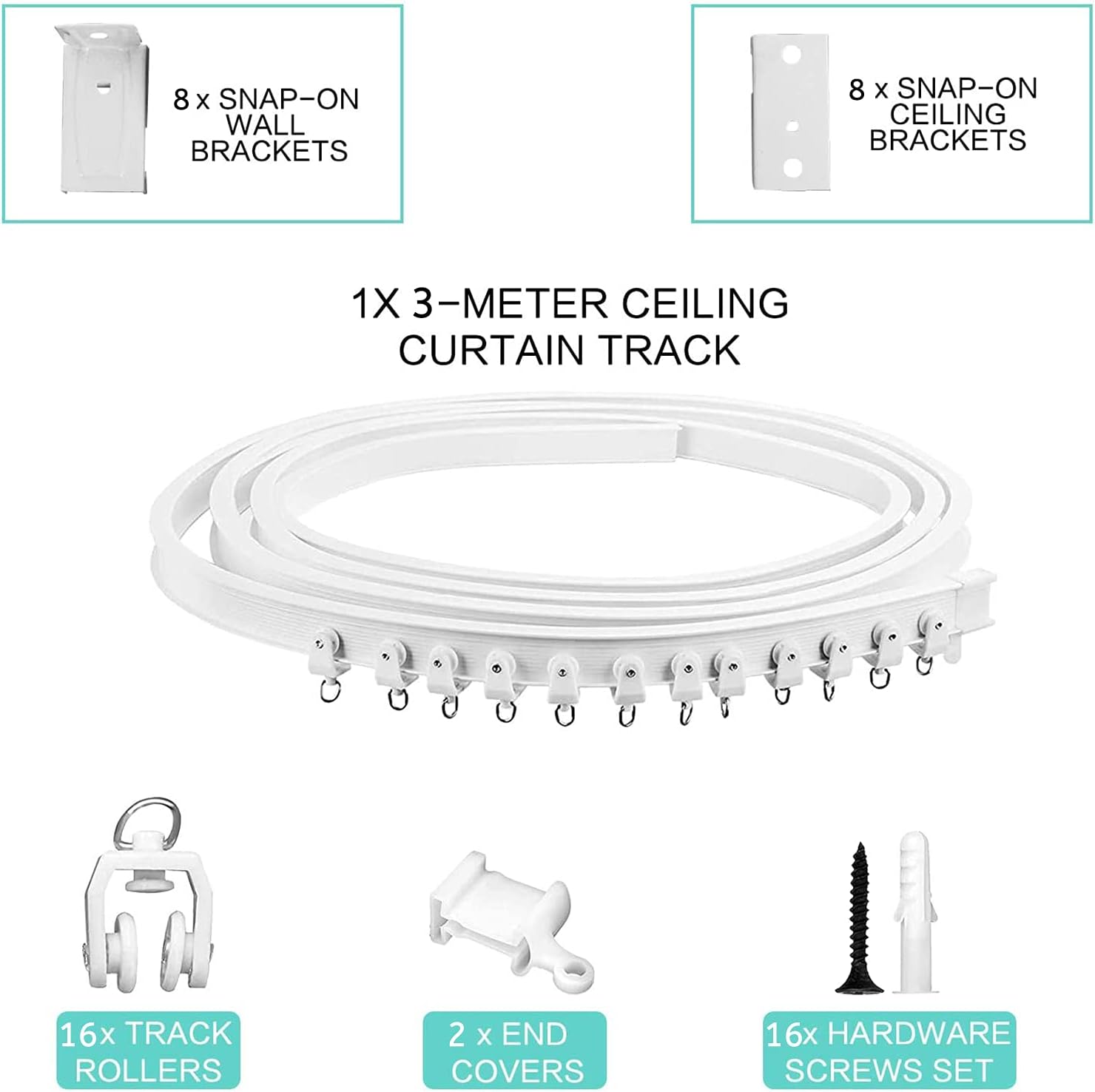 - Packungsinhalt: Im Paket sind 1x 3-Meter flexible Vorhangschiene, 16x Laufrollen, 8x Deckenmontagehalterungen, 8x Deckenseitenhalterungen, 2x Endkappen und 16x Schrauben- und Dübelsets enthalten. Wenn das von Ihnen erhaltene Zubehör fehlt, kontaktieren
