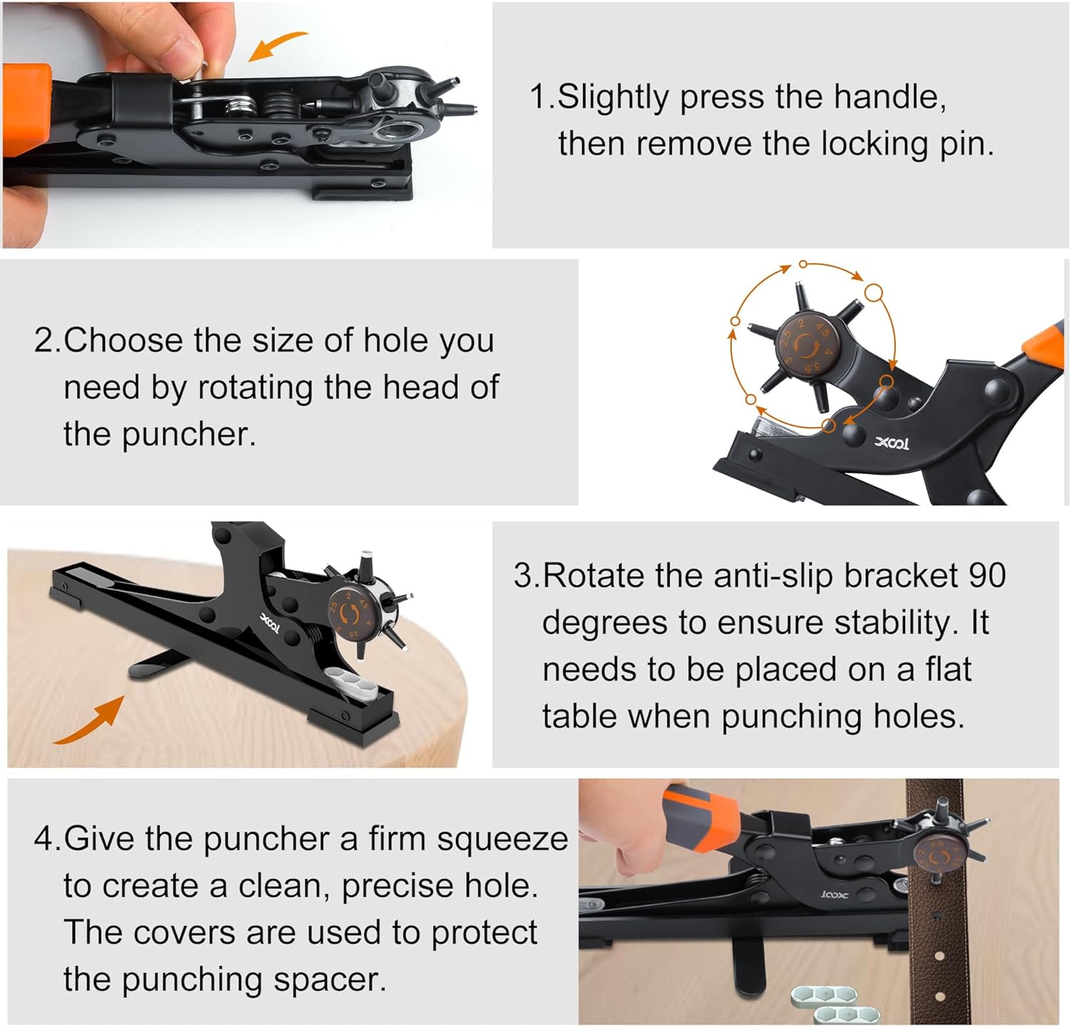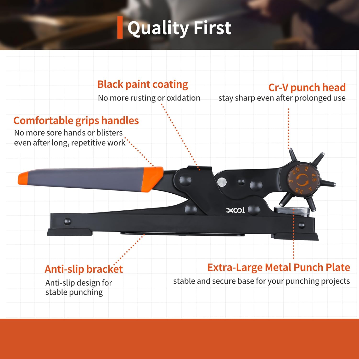 - Ausgezeichnete Produktleistung - Das einzigartige Design der Lochzange ermöglicht den einhändigen Gebrauch, wodurch Sie stärkere Stanzungen erstellen können; besonders nützlich als Lederlocher. Eine praktische Kufenhalterung bietet überlegene