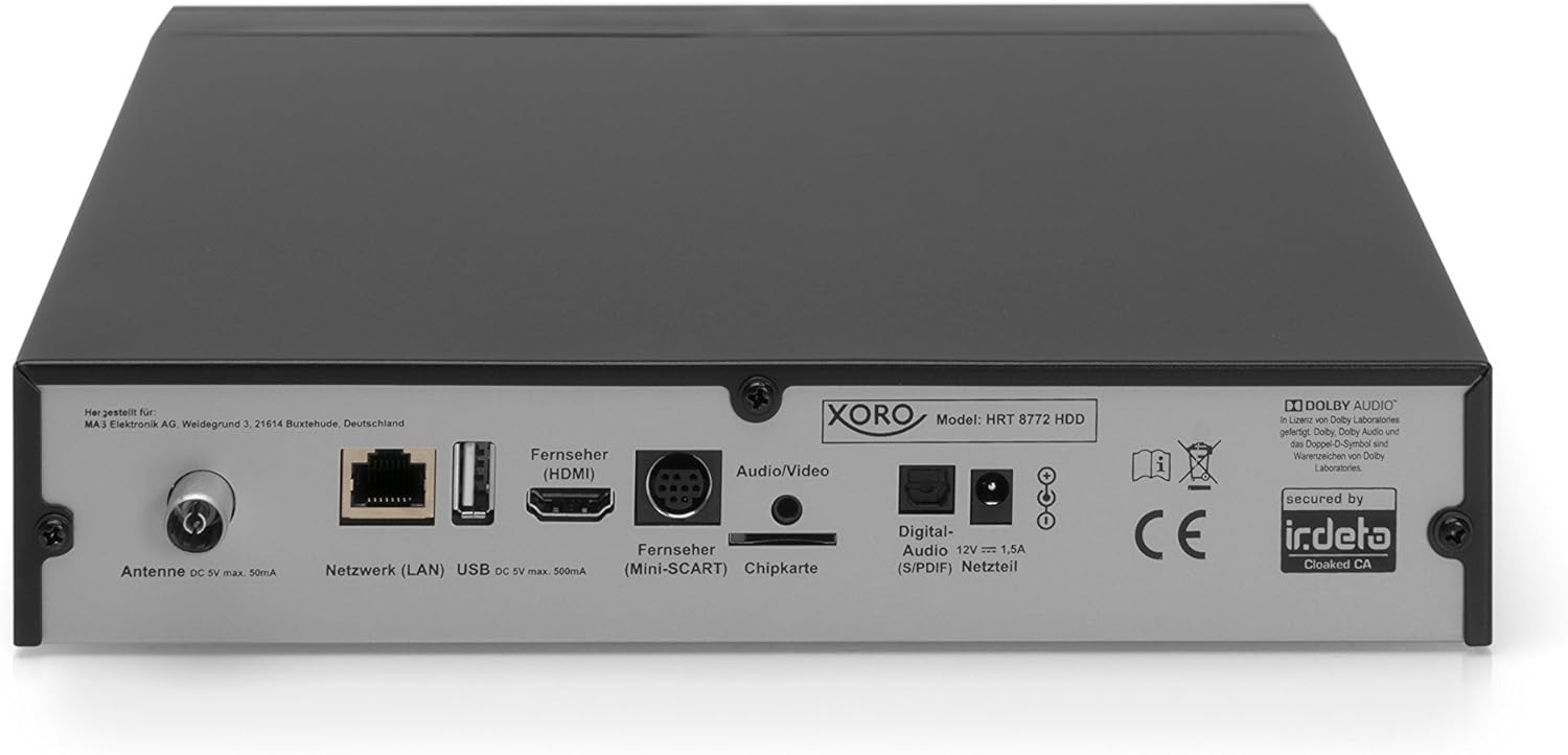 - HDMI- (bis zu Full HD/1080p), USB-Port, Mini-Scart & S/PDIF (optisch), 7 Segment LED Display, EPG, Videotext, Versorgungsspannung (+5V) für aktive Zimmerantennen zuschaltbar, 12V Anschluss