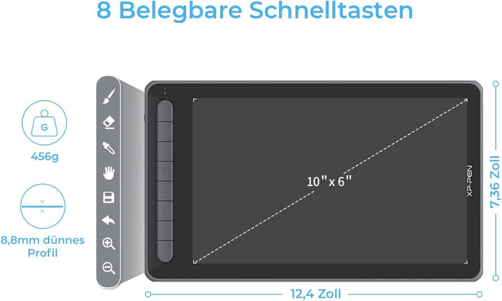 - {8 Belegbare Schnelltasten}Das Deco LW Zeichentablett hat 8 Schnelltasten, die sich im Pentablett-Treiber je nach unterschiedlichen Zeichenprogrammen einprogrammieren lassen, und somit die Computertastatur ersetzen können. Sie bieten viel