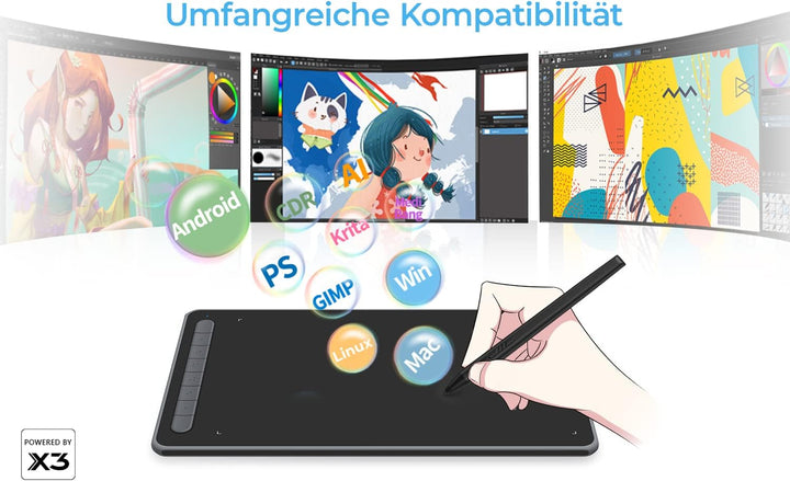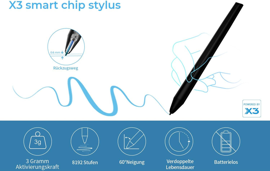 - {X3 Smart-Chip Stift}Deco LW Pen Tablet kommt mit einem neuen Stift, in dem X3 Smart-Chip statt integriert. So ist der Stift viel empfindlicher und stabiler, natürlicher wie der althergebrachte Bleistift. Mit der 8192 Stufen Sensitivität und 60°