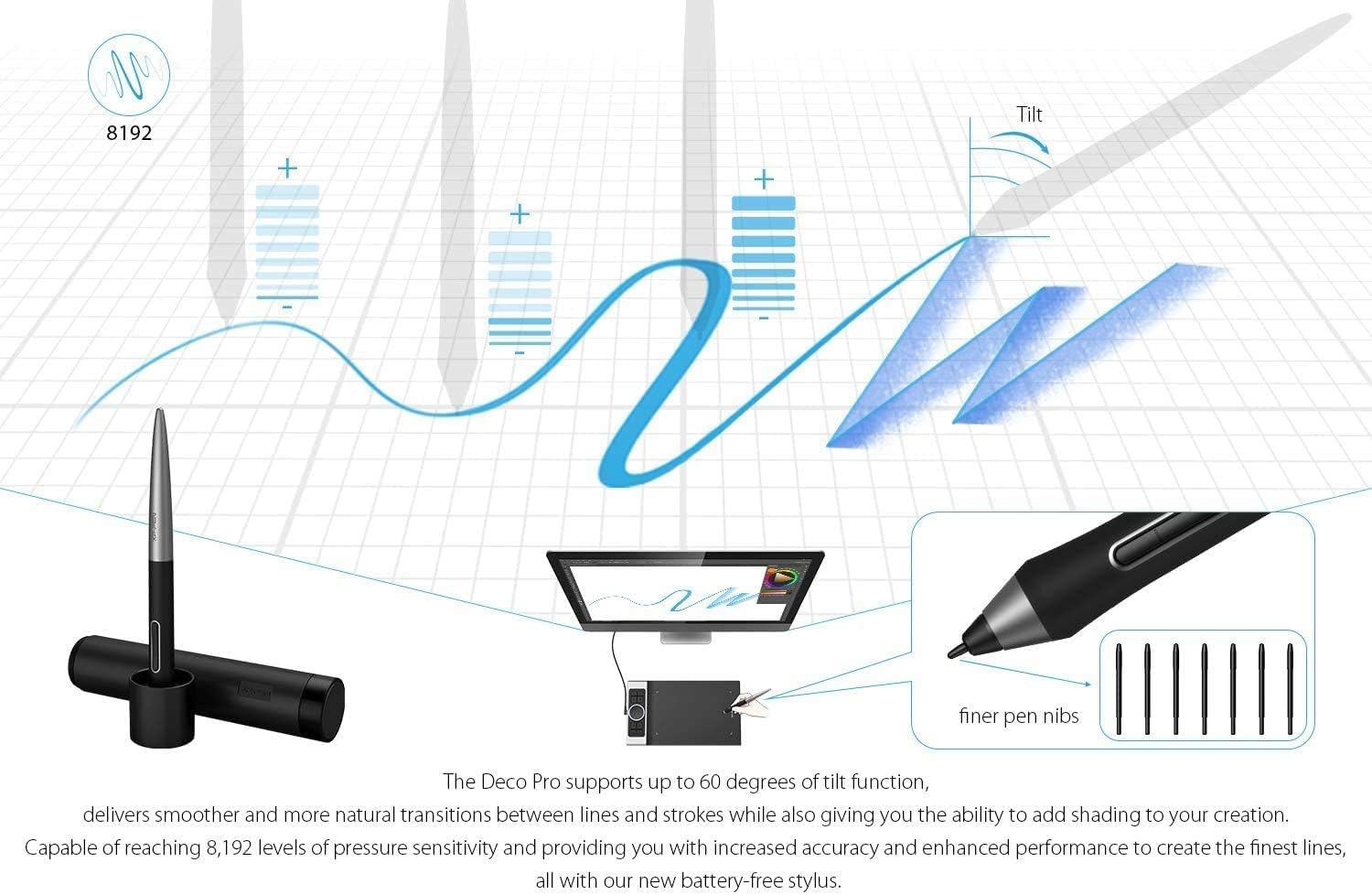 - ♣PA1 batteriefreier Stift: Bei diesem drawing tablet kann man eine hohe Drucksensitivität von 8192 Stufen und 60°Neigungserkennung erwarten und somit besonders glatte und genaue Linien zeichnen, was gerade für das detailreiche Arbeiten sehr wichtig