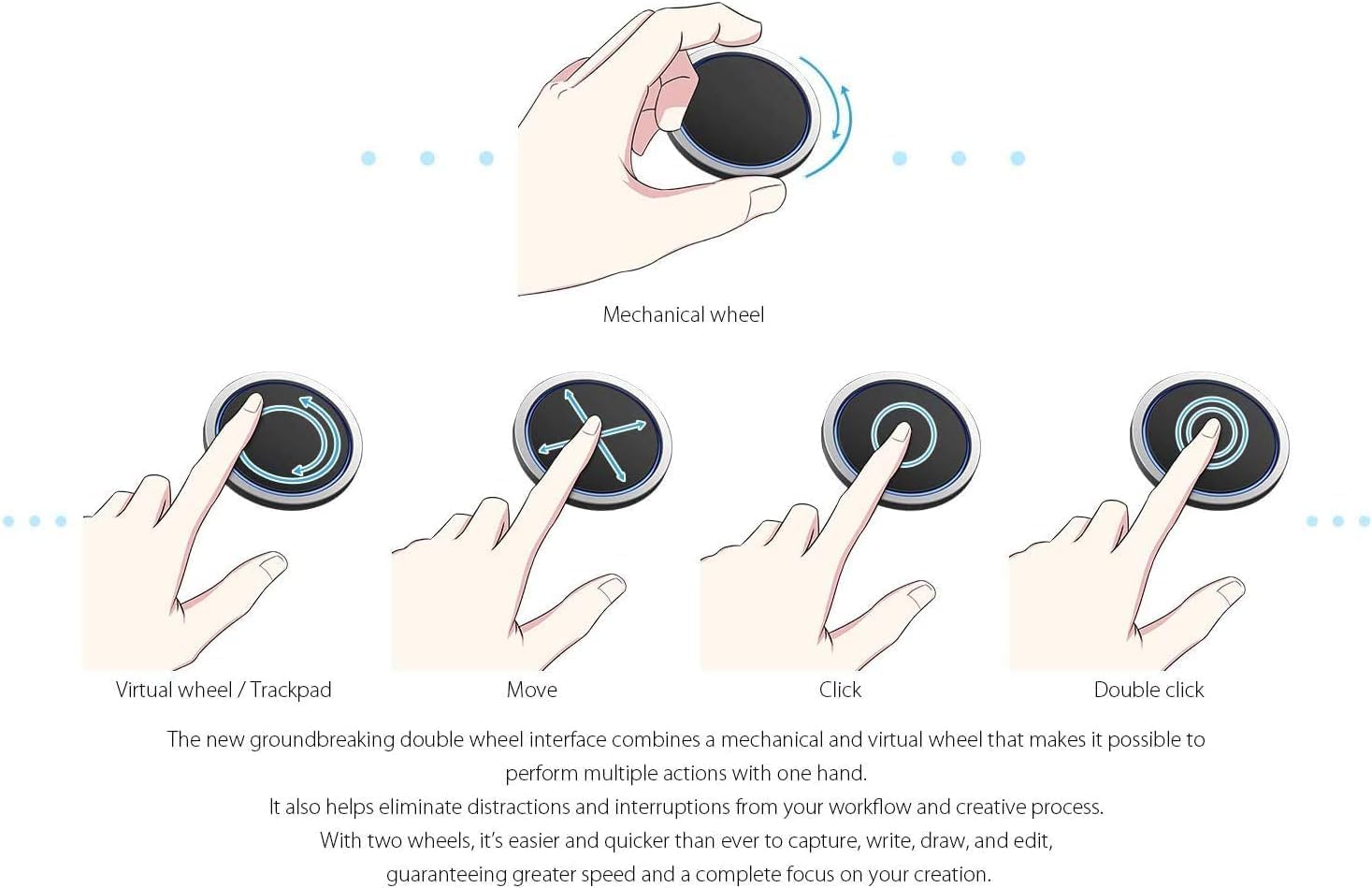 - ♣Das silberne Drehrad und schwarze Trackpad: Der Durchmesser des Drehrads beträgt 50mm,perfekte Grösse zur Bedienung.Mit dem silbernen Drehrad kann man einzoomen und auszoomen, Website abwärts oder aufwärts ziehen, Pinselgrösse einstellen oder mit