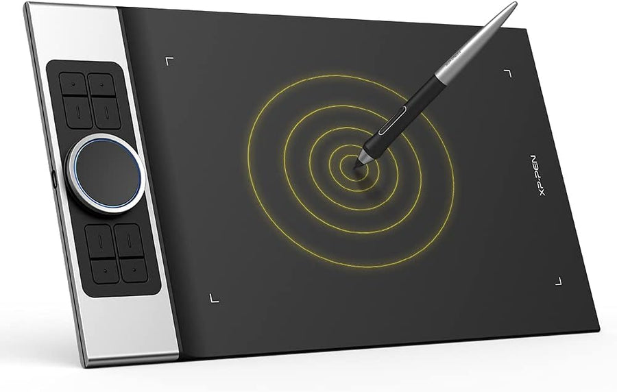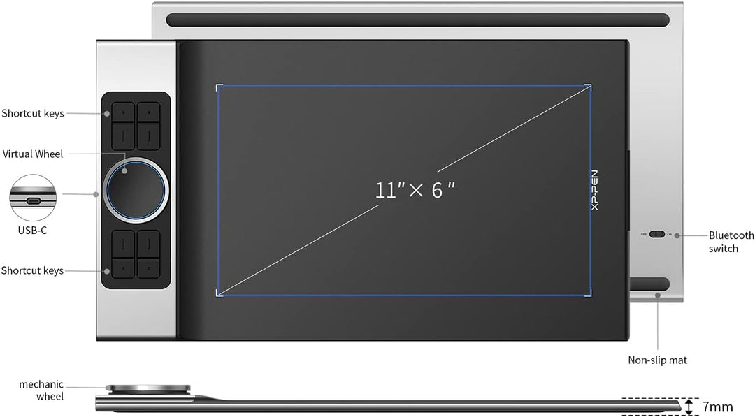 - ♣ Perfekte Grösse sowie wunderbares Design: 11"x6" aktiver Fläche nähert sich der Grösse des Computer-Bildschirms. Der Computer zeigt treu jede feine Linie an und reduziert die Verzerrung. Es gewinnt den Preis von Red Dot Design Award 2019 und Good Design Award 2018. Aus der rechten Seite befinden sich 8 Shortcut-Tasten und ein silbernes Drehrad und schwarzes Drehpad, mit denen mehrere Aktionen mit einer Hand ausgeführt werden können.
