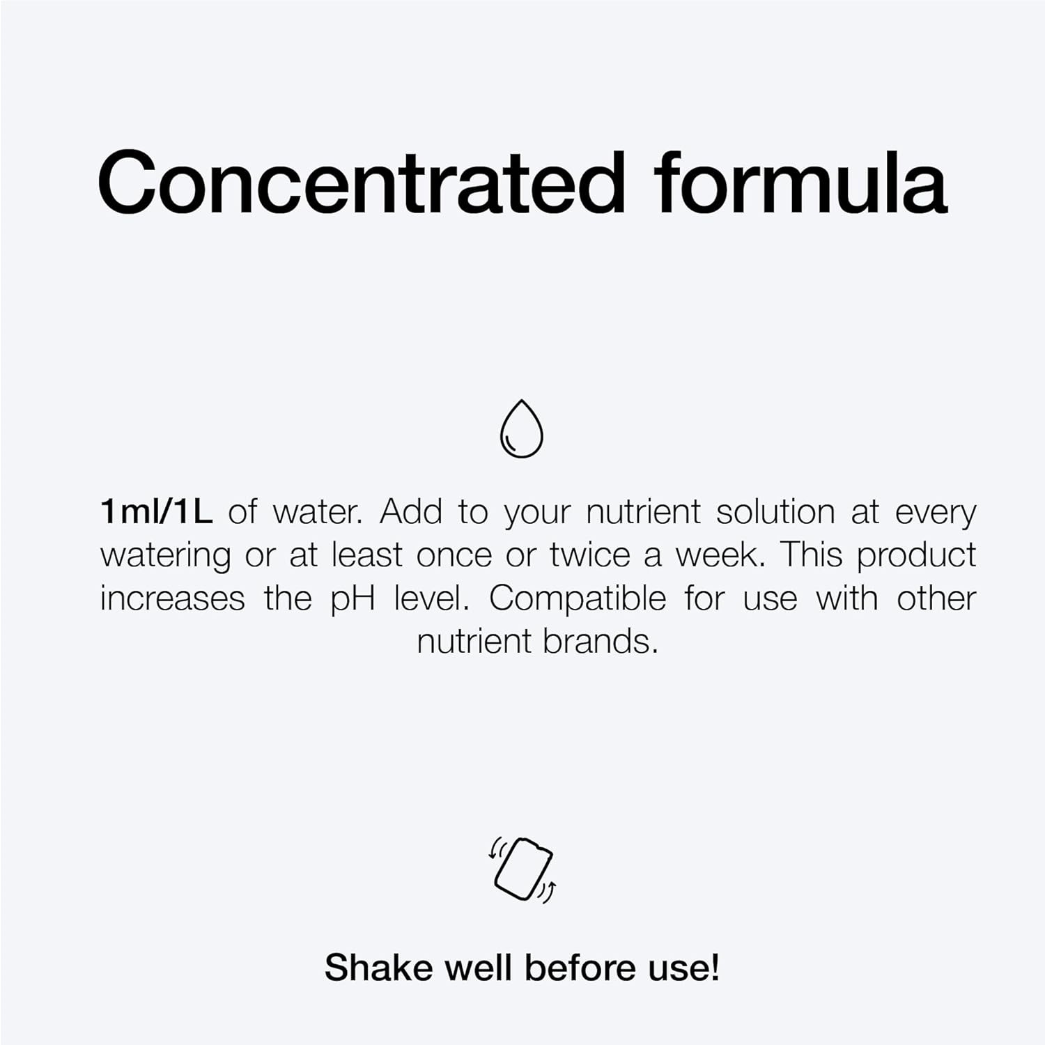- DOSIERUNG – 1 ml/1 l Wasser. Bei jedem Giessen oder mindestens ein- bis zweimal pro Woche zu Ihrer Nährlösung hinzufügen. Dieses Produkt erhöht den pH-Wert. Für alle Pflanzenarten geeignet.
