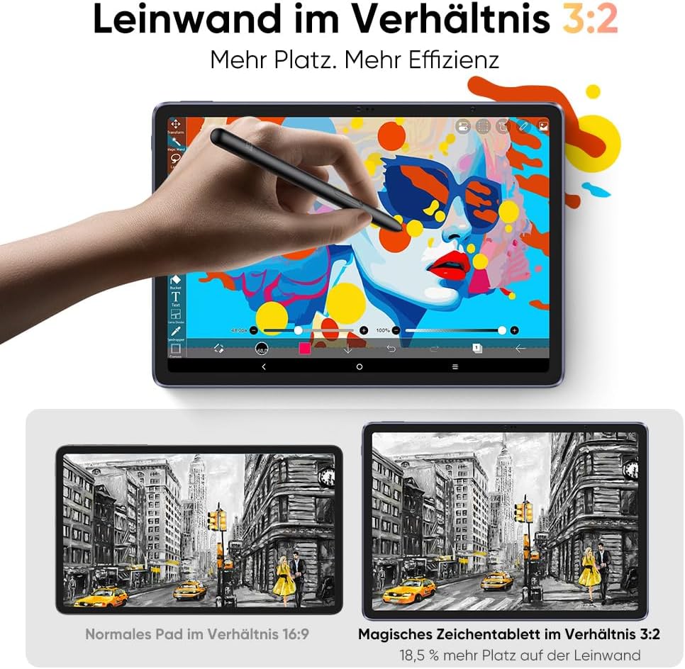 - Ultra-portabel: 12,2-Zoll-Bildschirm, 6,9 mm schlankes Design, 599g ultraleichtes Gewicht und 8000mAh grosse Batterie. Eigenständiges Android-System, das nicht an einen Computer angeschlossen werden muss. Sie können arbeiten, wo immer Sie wollen, von