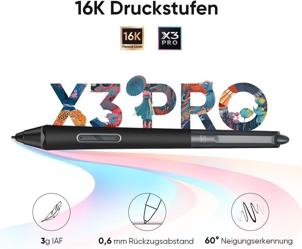 - Der X3 Pro Smart Chip Stylus verfügt über die branchenweit ersten 16384 Druckstufen, die 100 % höher sind als bei vergleichbaren Geräten. Das digitale Zeichentablett ist mit diesem Stift ausgestattet und ermöglicht präzisere und flüssigere Linien