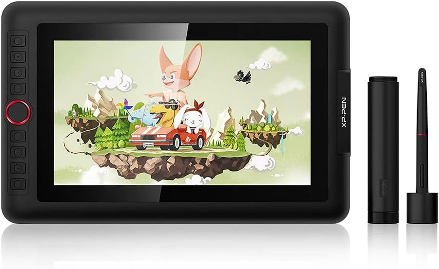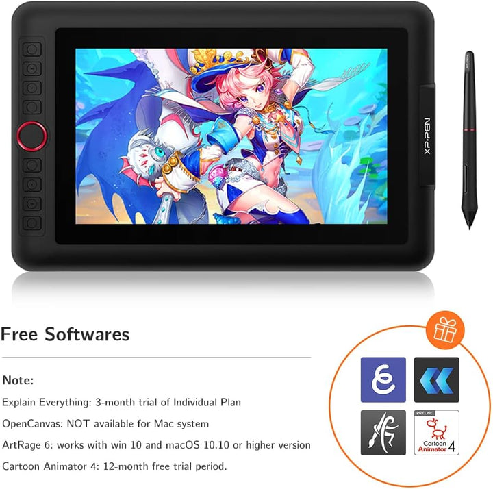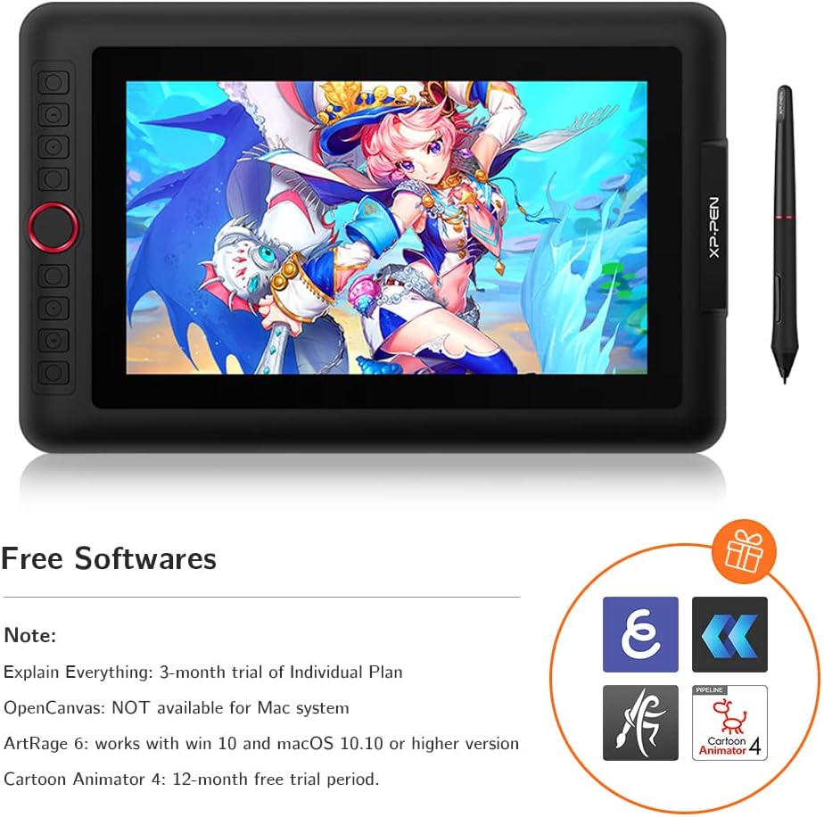 - XP-PEN Artist 12 Pro, tragbarer Bildschirm mit einer aktiven Oberfläche von 11,6 Zoll, Masse: 351,52 x 225,38 x 12,9 mm, Dicke: 14 mm, Auflösung: 1920 x 1080 Pixel, Blickwinkel: 178°.