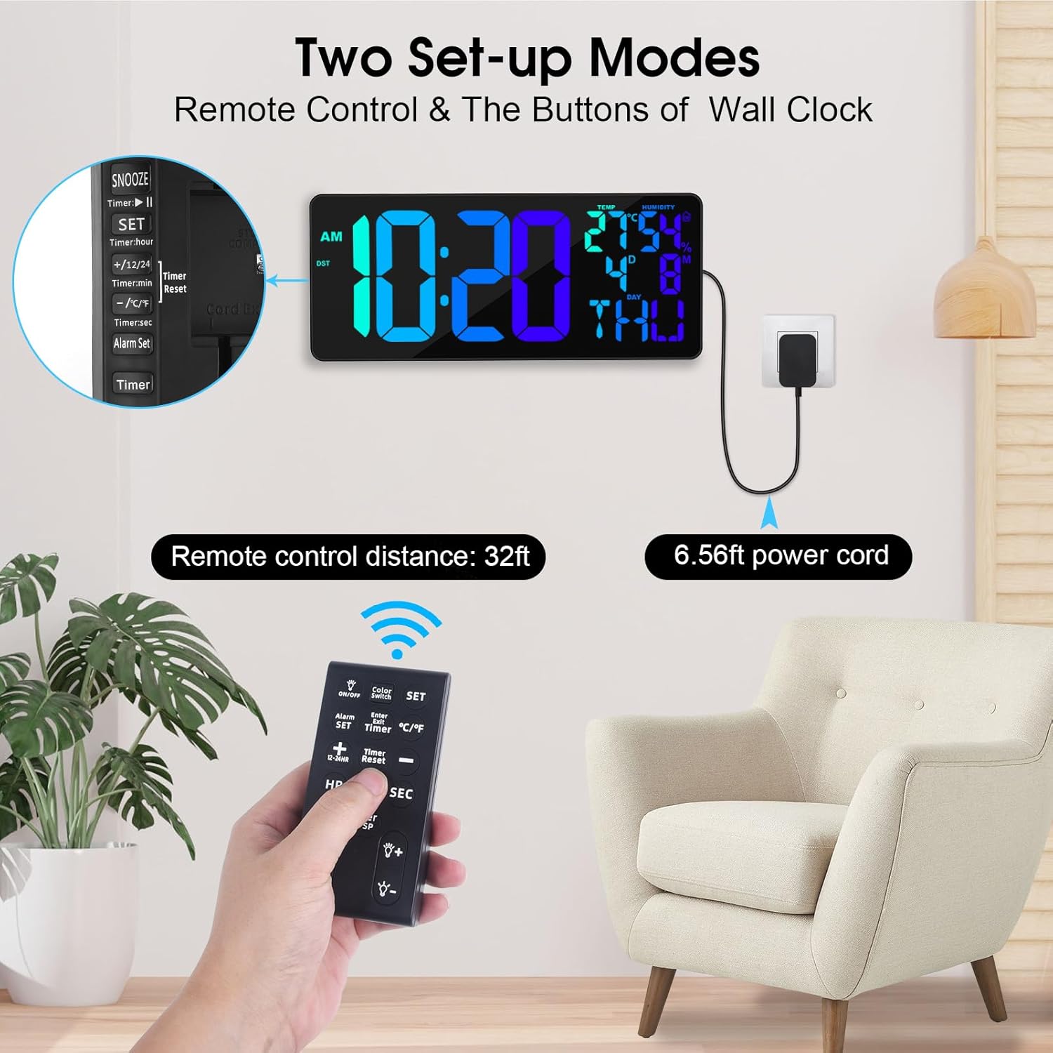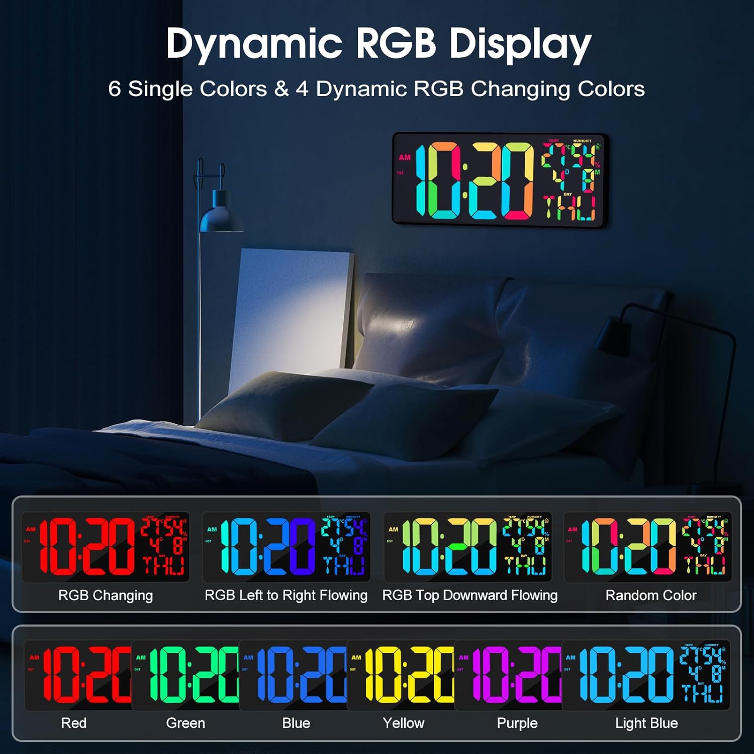 - 【Digitaler Wanduhr mit Farbwechsel】Dieser grosse digitale Wanduhr mit Farbwechsel bietet 6 monochrome Modi und 4 dynamische RGB-Farbwechselmodi zur Auswahl. Darüber hinaus fügt der einzigartige 11. tägliche Farbwechselmodus Überraschung und Spass