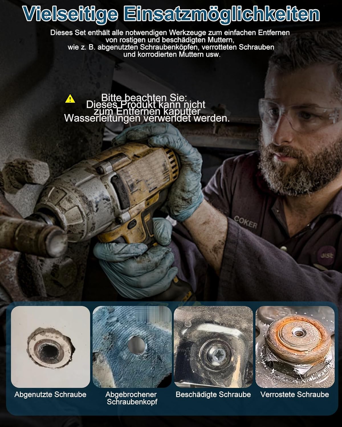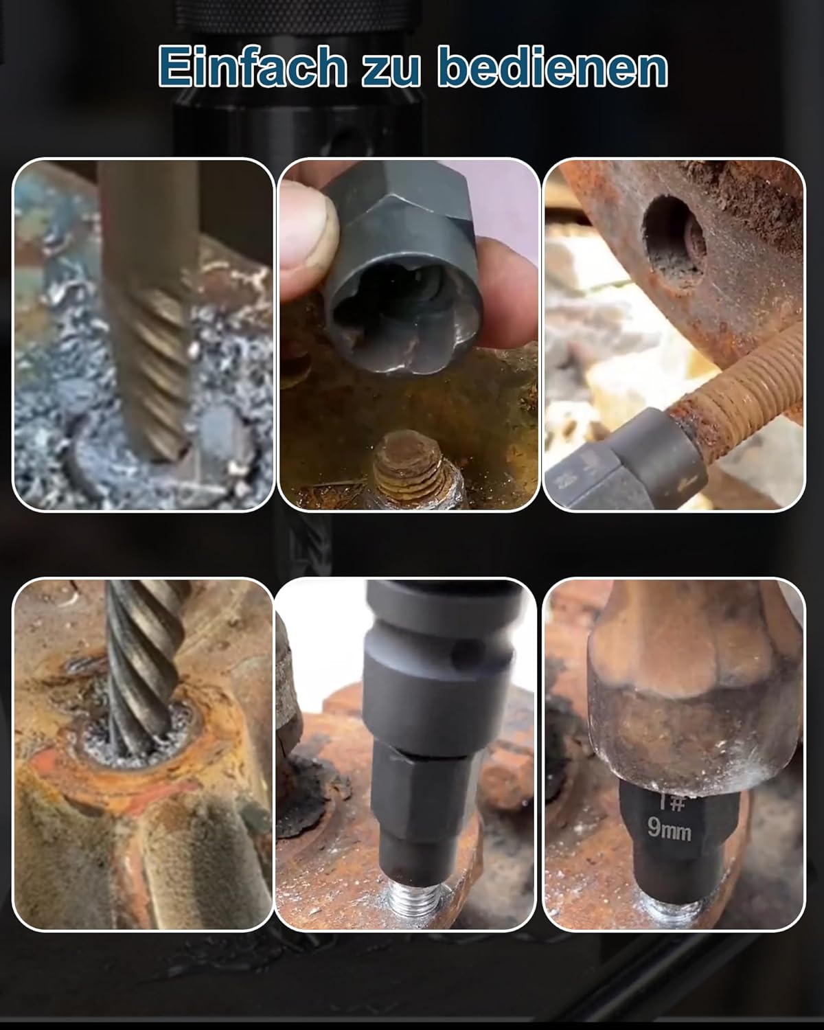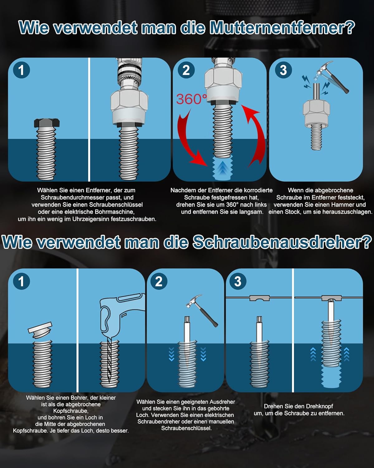 - Breites Anwendungsspektrum:Dieser Schrauben Ausdreher Set enthält alle notwendigen Werkzeuge, um rostige, beschädigte Muttern wie abgeschlagene Schraubenköpfe, verrottete Schrauben und korrodierte Muttern usw. leicht zu entfernen. Es kann auch zum