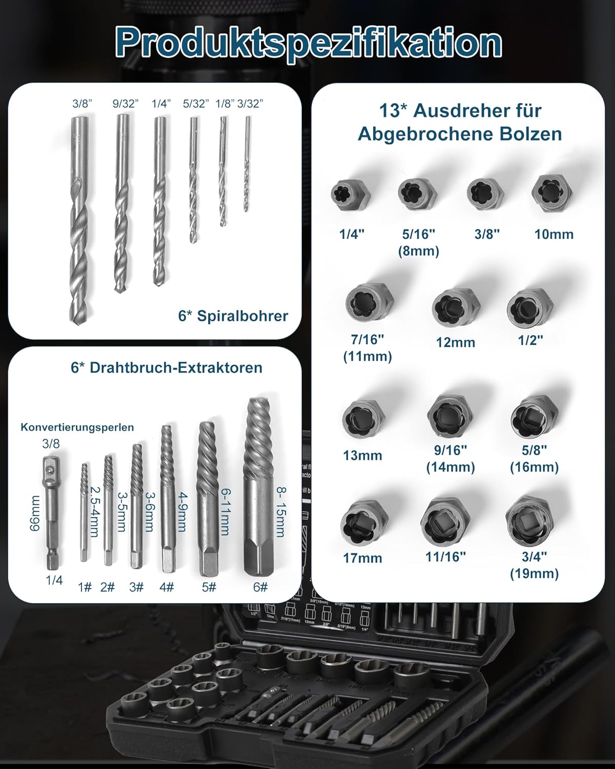- Packliste: 13* Schraubenausdreher (1/4" - 5/16" (8mm) - 3/8" - 10mm - 7/16" (11mm) - 12mm - 1/2" - 13mm - 9/16" (14mm) - 5/8" (16mm) - 11/16" - 17mm - 3/4" (19mm)), 6* Spiralbohrer (3/32", 1/8", 5/32", 1/4", 9/32", 3/8"), 6* Drahtbruchentferner (1#, 2#,
