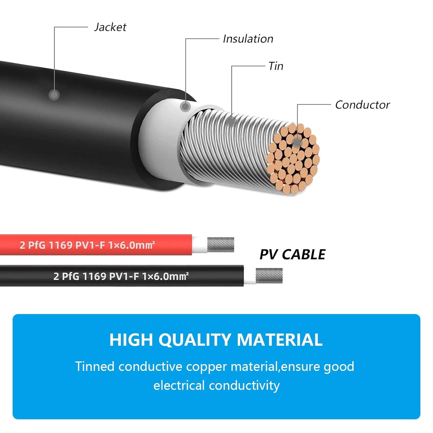 - ☀☀☀【Technische Daten】Professionelles Photovoltaik-Solarkabel, TÜV, CE-Zertifizierung, Querschnittsfläche: 6mm², Temperaturbereich: Umgebung -45°C +85°C, Prüfspannung: 6500V, Leiterwiderstand: (20°C) ≤5,09 Q2/KM,