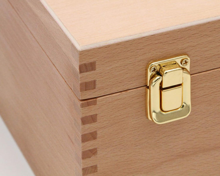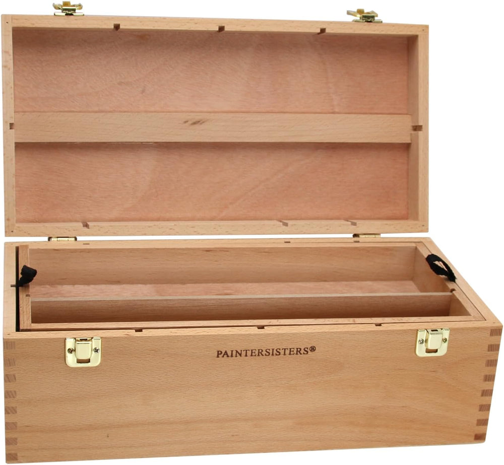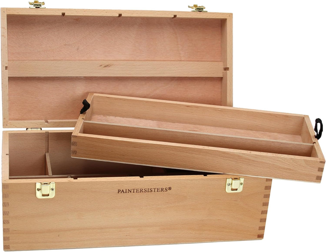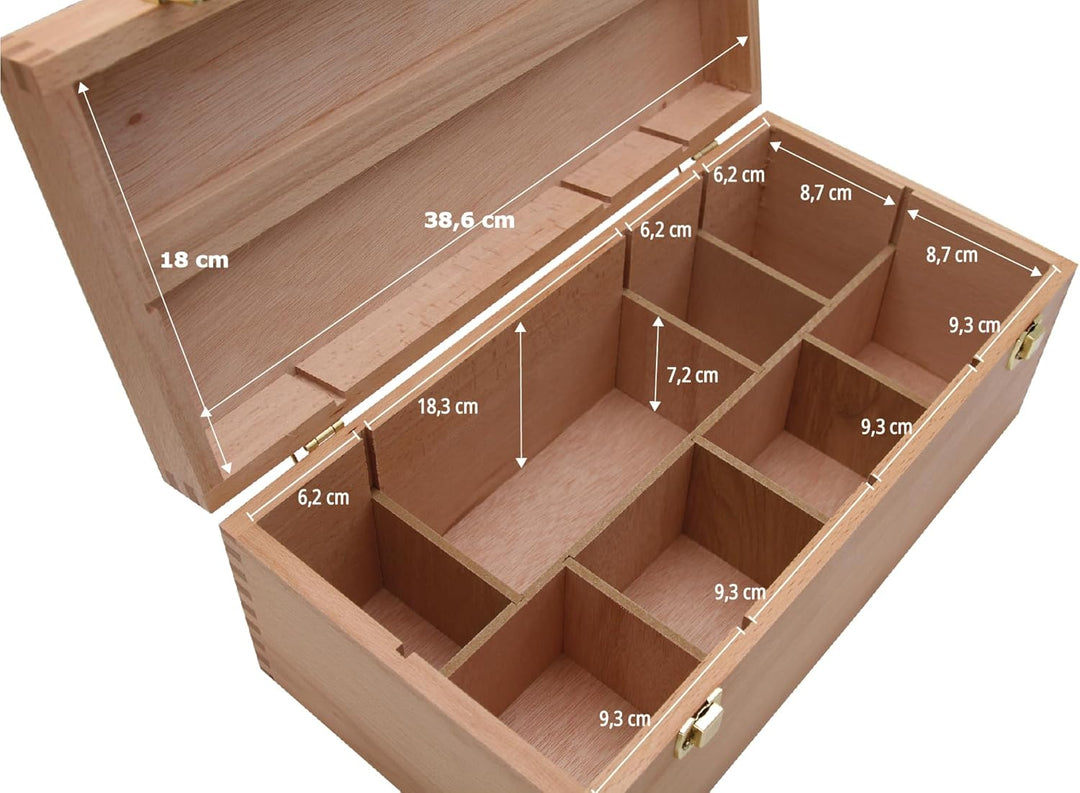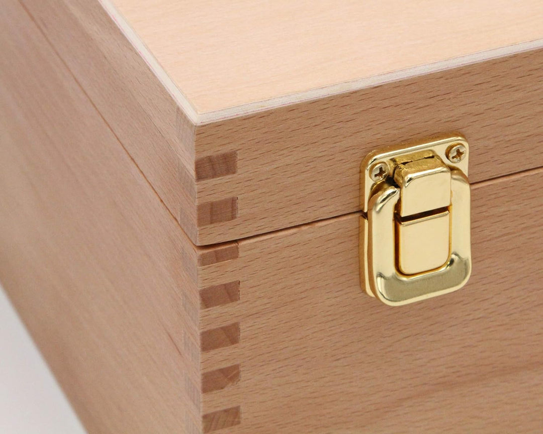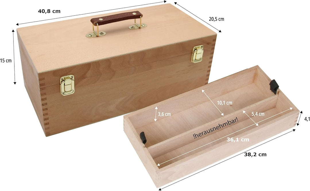 - QUALITÄT: Der grosse und stabile Malkoffer ist aus feinem Buchenholz FSC handwerklich gefertigt. Die Stosskanten sind passgenau mit Verzahnungen ausgeführt. Das Holz ist aussen schutzlasiert und innen naturbelassen. Ein stabiler Tragegriff und solide