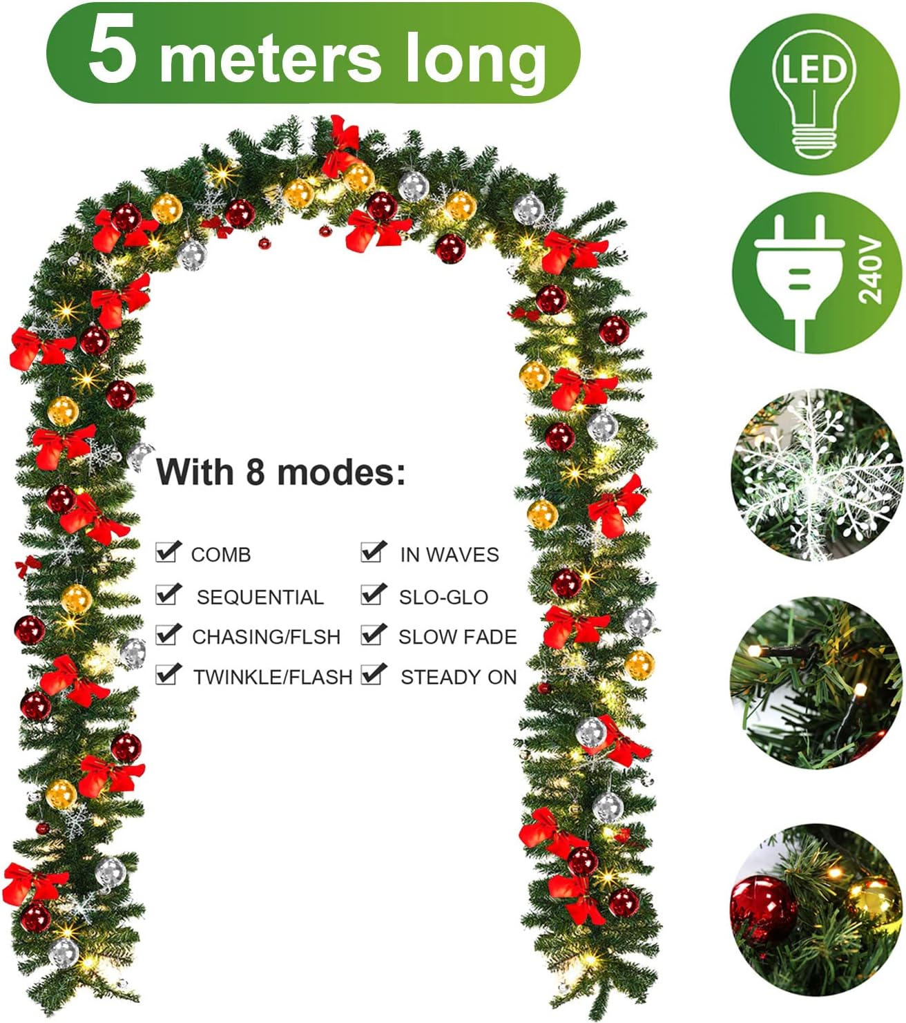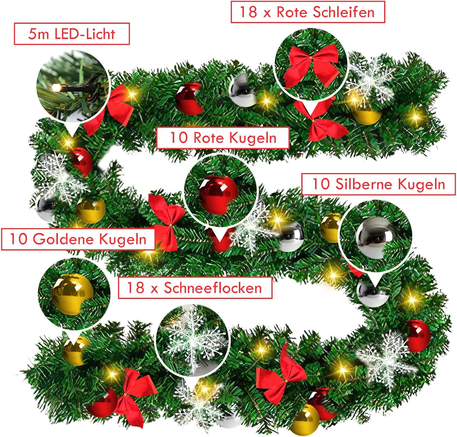 - 🍒Lieferumfang: Umweltfreundlich & Wiederverwendbar--2x Tannengirlanden, Länge:5 m inkl. Deko(18 Sich beugen ;18 Schneeflocke; 10 roter Ball;10 Silberkugel; 10 Goldener Ball;) Anzahl LEDs: 100 Stück ,Lichtfarbe: warmweiss, Länge Stromkabel: 5m. Die