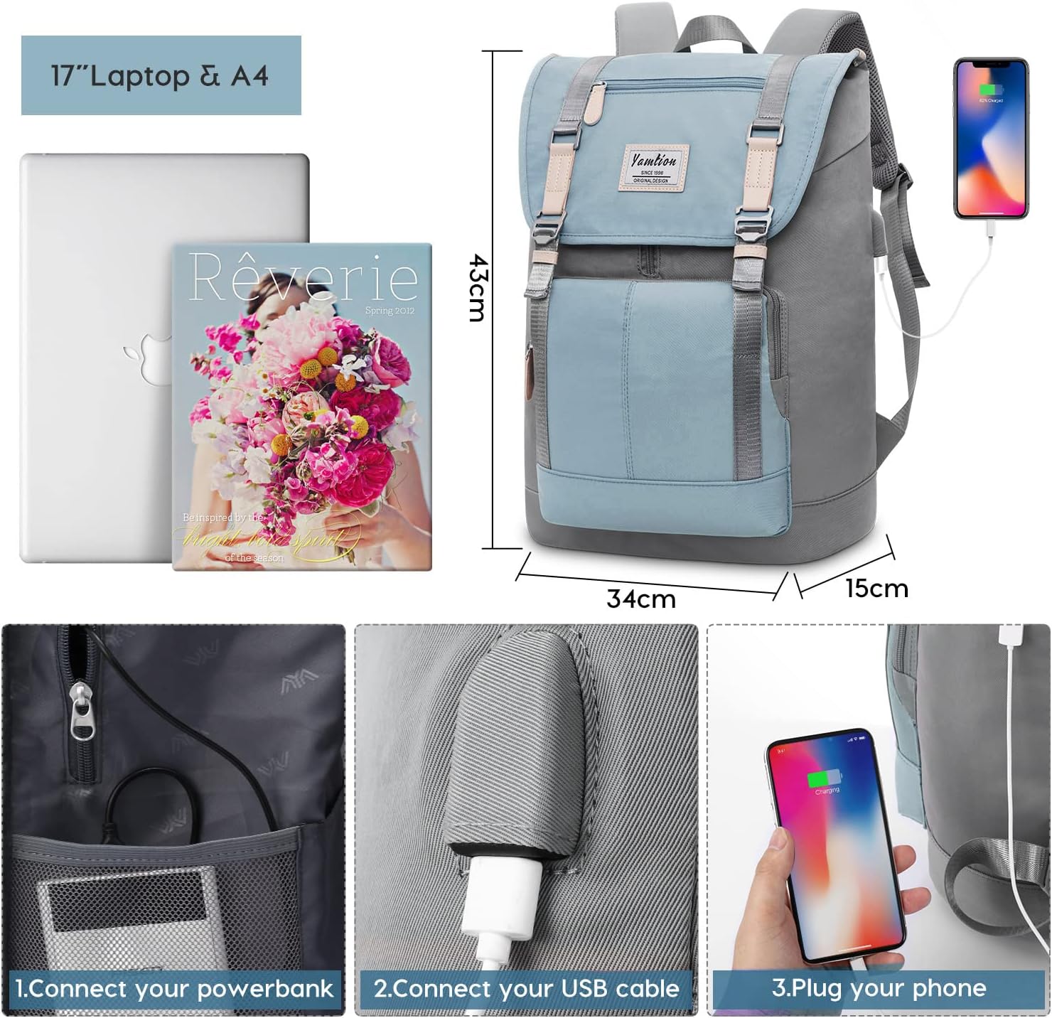 YAMTION Laptop Rucksack 17 Zoll für Damen & Herren,Rucksack Schule Mädchen Schulrucksack Frauen Schu