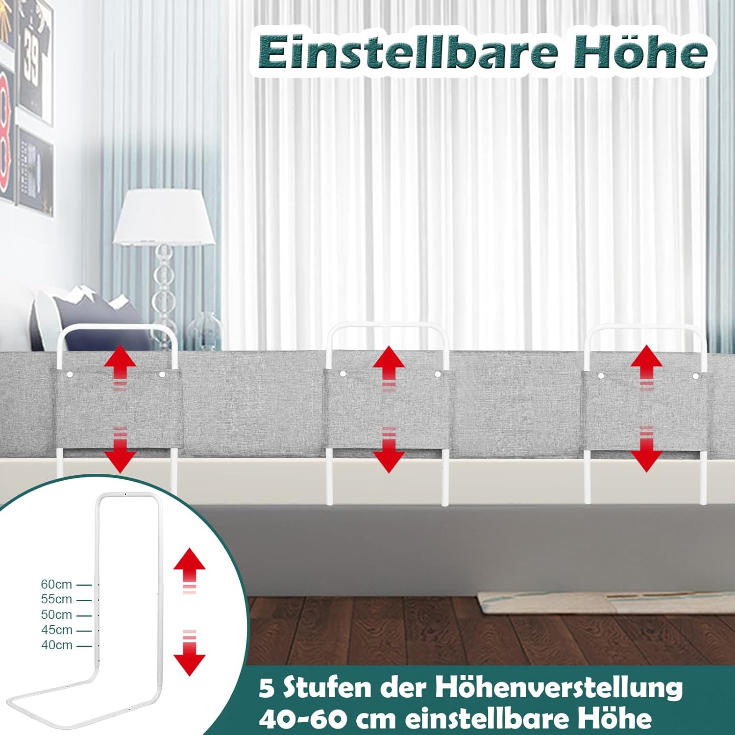 - Höhenverstellbar - Dieser Bed rail hat 5 verstellbare Positionen von 40-60 cm, drücken Sie einfach die Murmeln, um die Höhe der Unterstützung entsprechend der Dicke der Matratze einzustellen. Es besteht also kein Grund zur Sorge, dass die Matratze