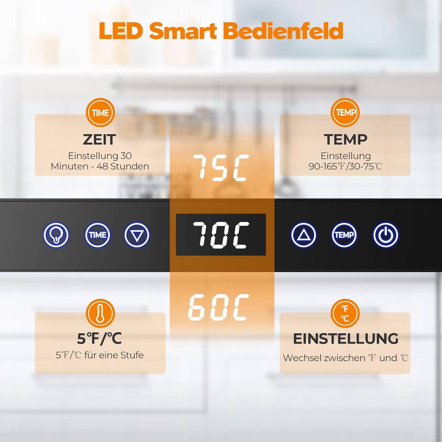 - Intelligente digitale Steuerung für den Dörrautomat: Die leicht einstellbare Zeit und Temperatur über das klare LED-Display machen den Dörrprozess mühelos. Der Temperaturbereich zwischen 30–75 °C und der Timer bis zu 48 Stunden ermöglichen eine