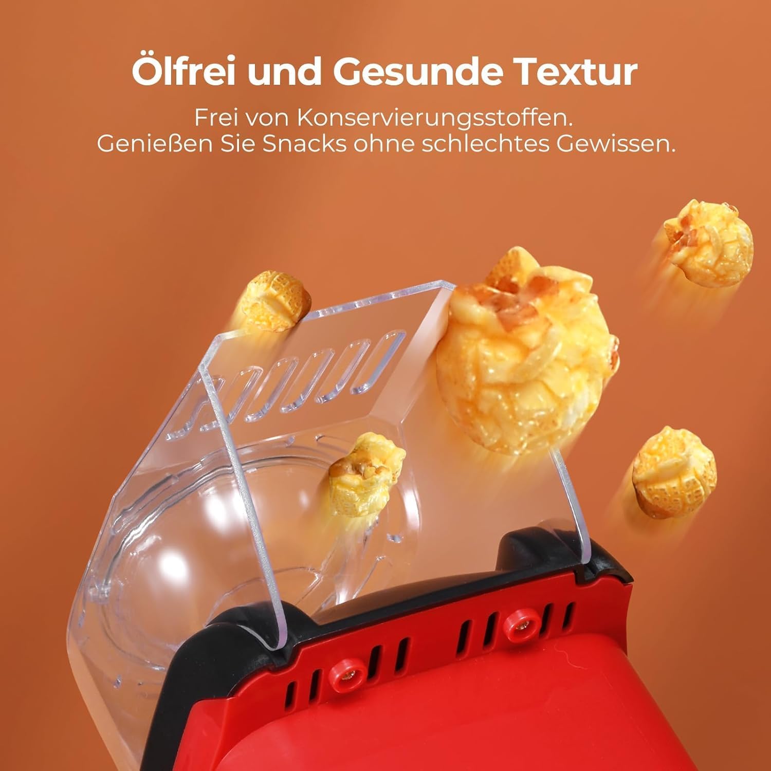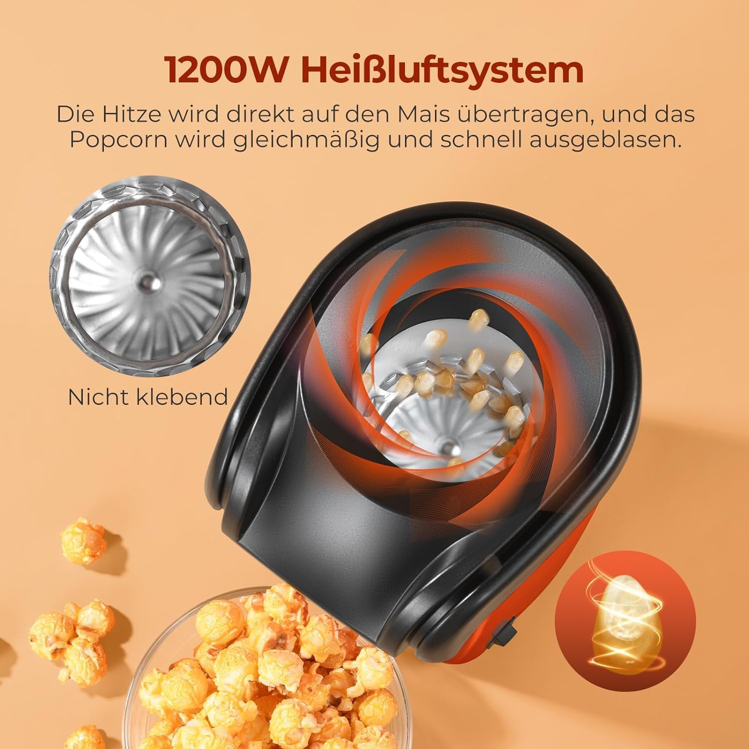 - 【Leistungsstarkes System】 Unser Popcornmaschine ist mit einem robusten 1200-W-Heizelement ausgestattet, das ein schnelles und gleichmässiges Aufplatzen der Körner gewährleistet. Das fortschrittliche Heissluftzirkulationssystem erreicht innerhalb