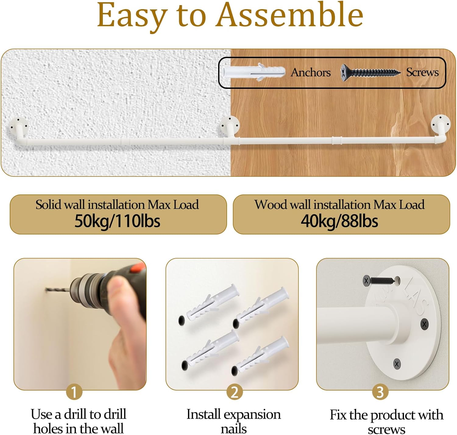 - WAS SIE BEKOMMEN: 2 hochbelastbaren Kleiderstangen, die sich an der Wand anbringen lassen und viel Platz für Ihre Kleidungsstücke bieten. Als Geschenk wird eine Rolle Rohmaterialband für die Verbindung von Mantelstange und Rohrfittings mitgeliefert,